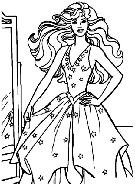 Descriere: Plansa de colorat cu Barbie care poarta o rochie de printesa cu stelute.