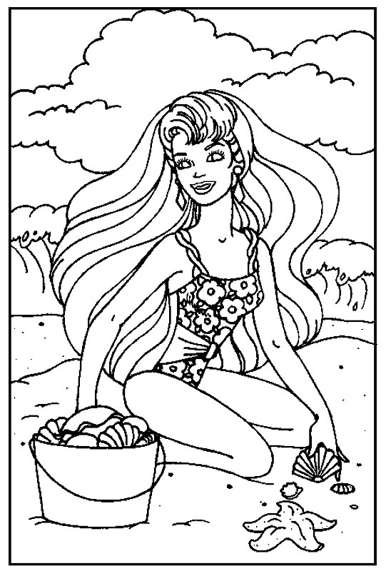 Descriere: Plansa de colorat cu Barbie la mare unde a gasit pe plaja cateva scoici si o steluta de mare.