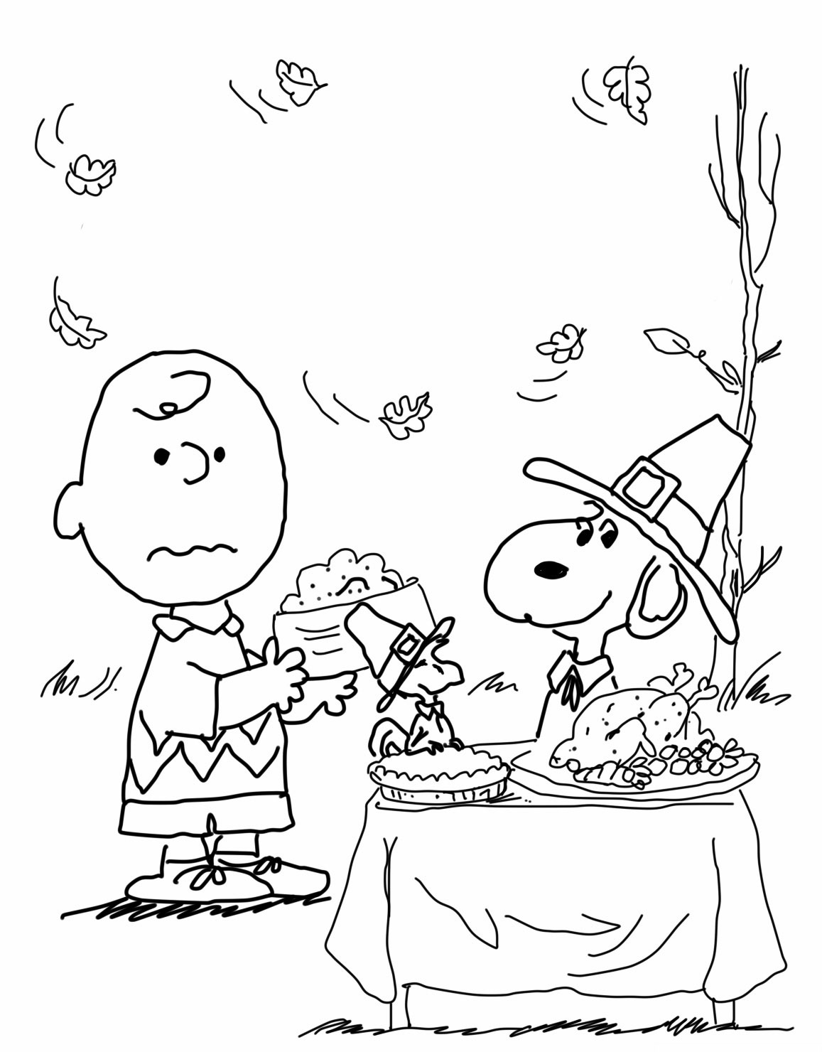 Descriere: Coloreaza plansa cu Charlie Brown si Snoopy Show la masa de Ziua Recunostintei.