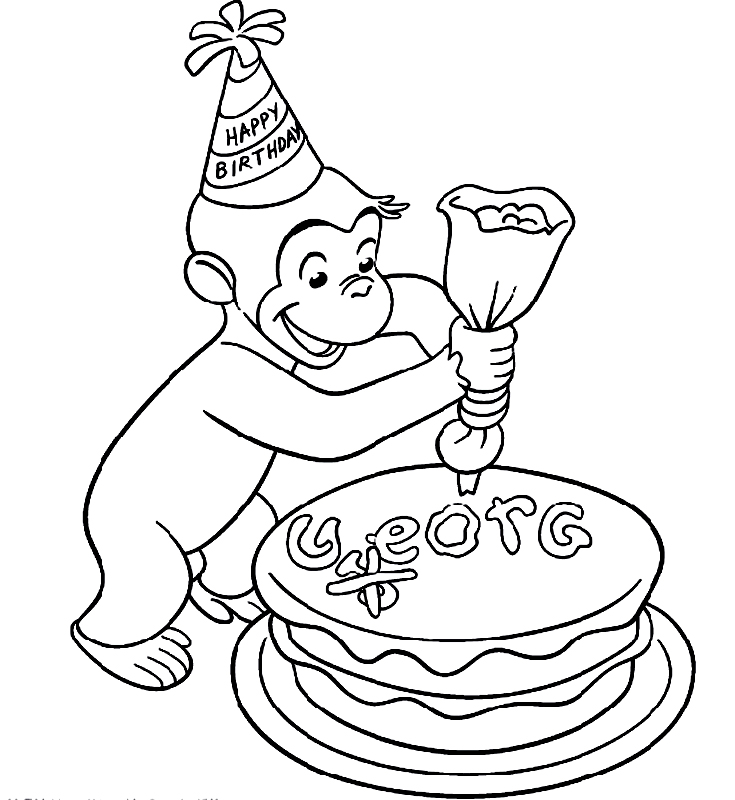 Descriere: Plansa de colorat cu maimutica George decorand tortul.