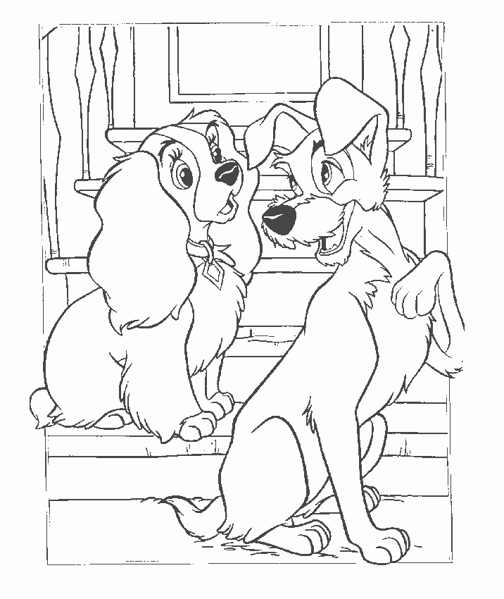 Descriere: Plansa de colorat cu desenele animate "Doamna si vagabondul".