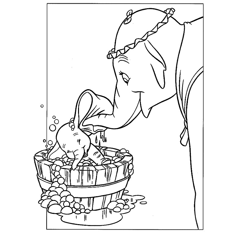 Descriere: Plansa de colorat cu elefantul Dumbo care este spalat de mama lui.