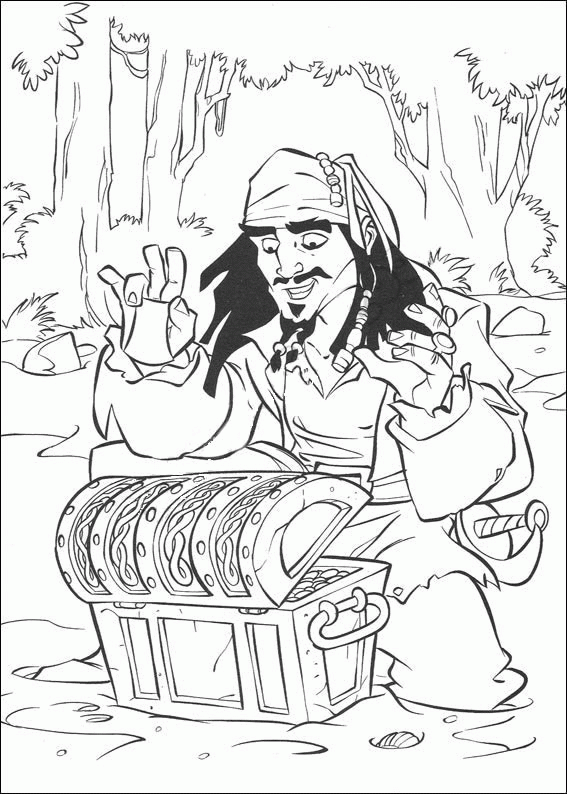 Descriere: Plansa de colorat cu desenele animate "Piratii din Caraibe". Coloreaza-l pe Jack Sparrow si comoara sa.