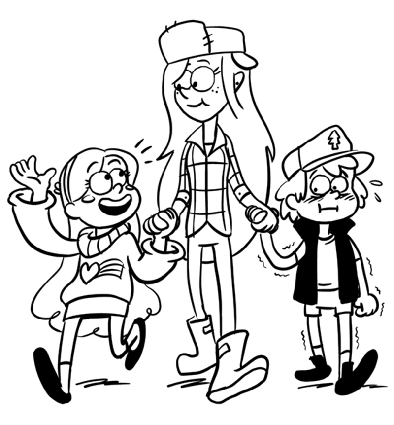 Descriere: Coloreaza plansa cu cei doi frati gemeni, Dipper si Mabel care sunt tinuti de mana de Wendy. Ii gasim pe Disney Channel in serialul Gravity Falls.