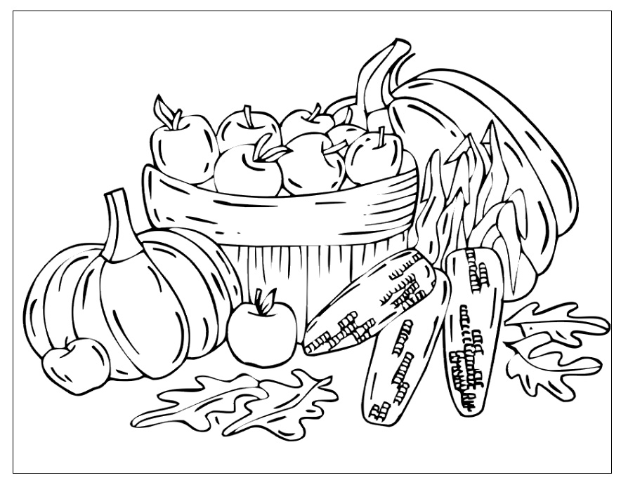 Descriere: Plansa de colorat cu dovleci, mere si porumb.