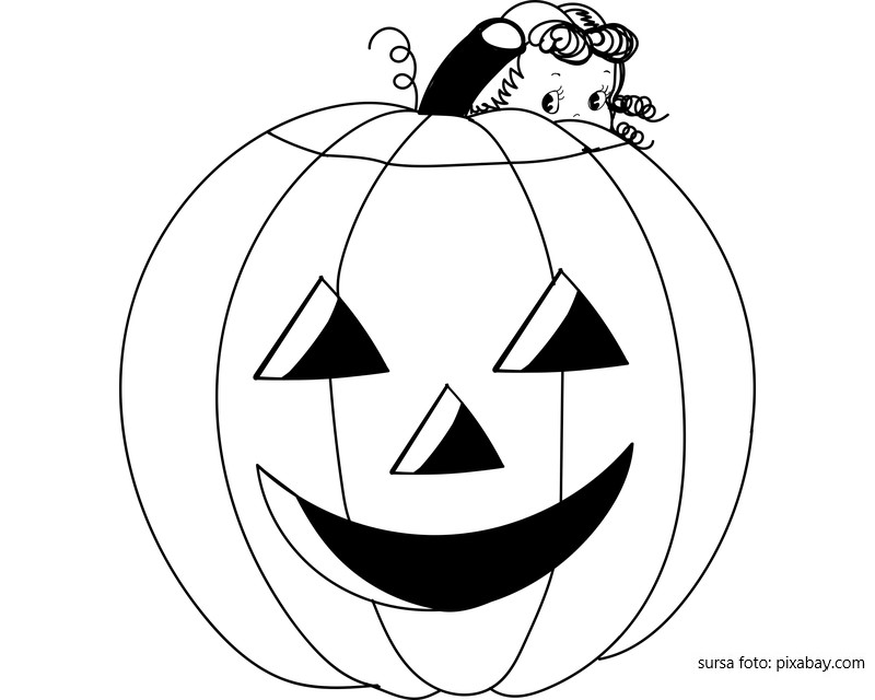 Descriere: Coloreaza aceasta scena cu un copil ascuns dupa dovleacul mare de Halloween.
