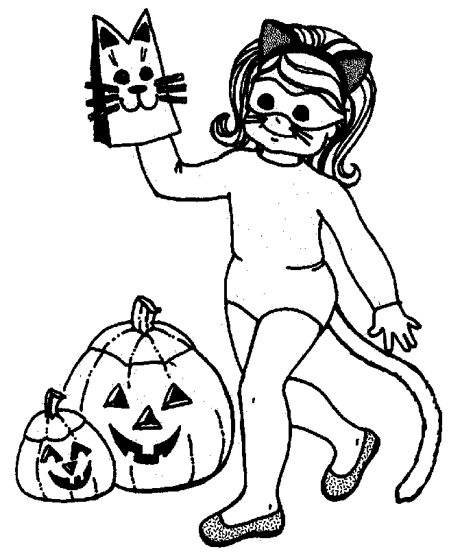 Descriere: Plansa de colorat de Halloween cu un costum de pisica.