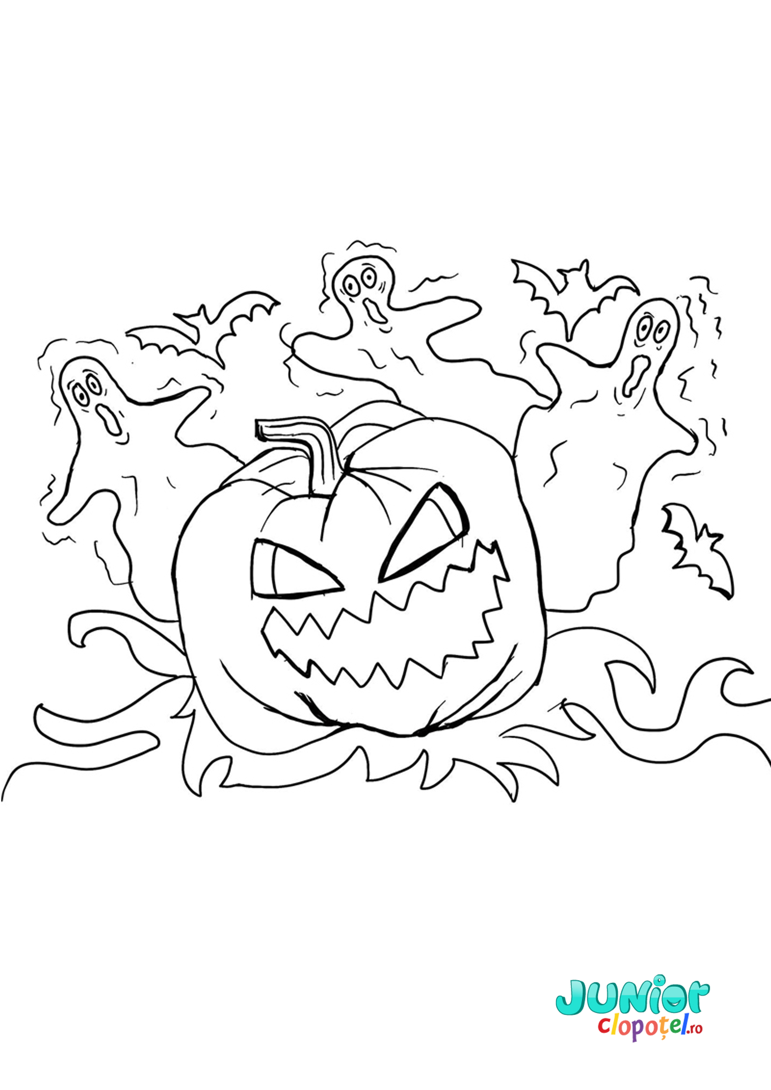 Descriere: Plansa de colorat cu dovleacul, fantomele si liliecii de Halloween.