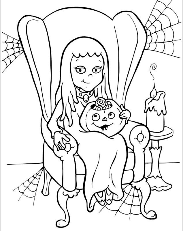 Descriere: Plansa de colorat cu Wednesday Addams, fetita din Familia Adams care asteapta sarbatoarea de Halloween avand in brate un dovlecel plin cu bomboane.