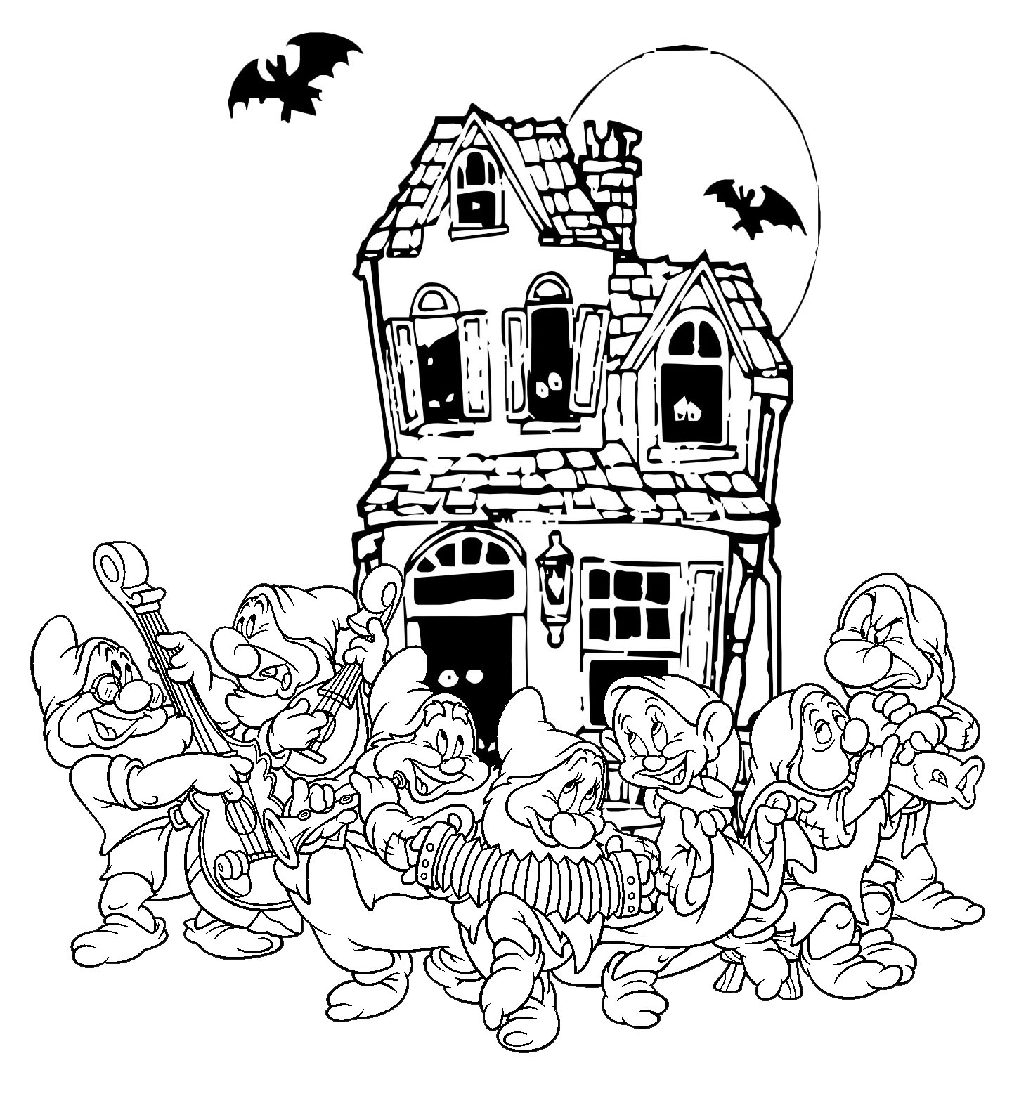 Descriere: Coloreaza piticii din Alba ca Zapada care colinda de Halloween.