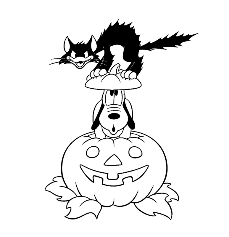 Descriere: Coloreaza plansa cu Pluto care iese din dovleacul de Halloween si pisica diabolica care asteapta sa-l sperie.