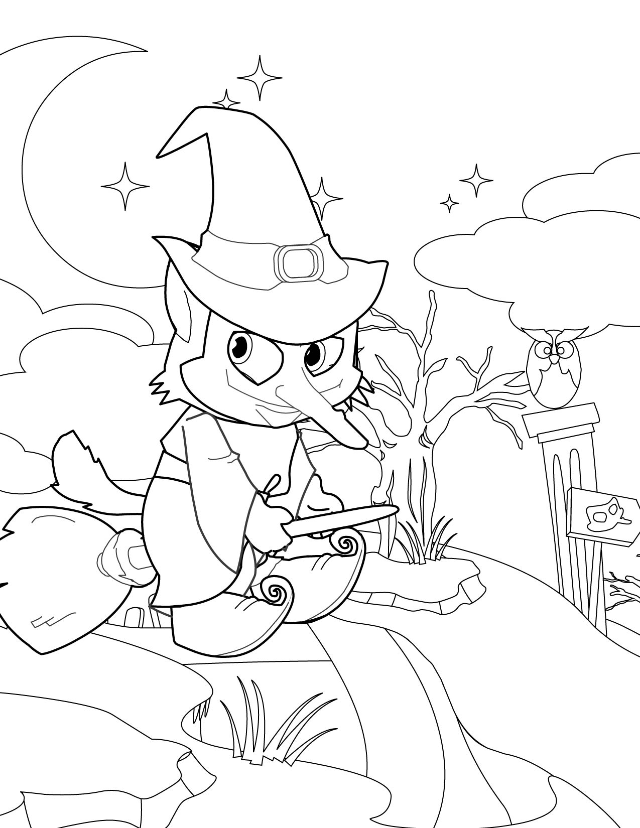 Descriere: Coloreaza plansa de Halloween cu vrajitoarea si bufnita.