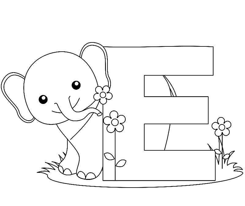 Descriere: Plansa de colorat cu litera E care s-a imprietenit cu un elefant.