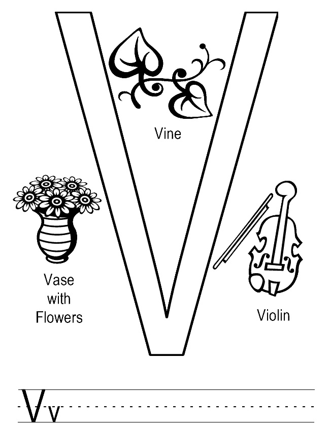 Descriere: Litera V te asteapta sa o colorezi alaturi de o vioara, un vas cu flori si o planta agatatoare care are frunze in forma de inima.