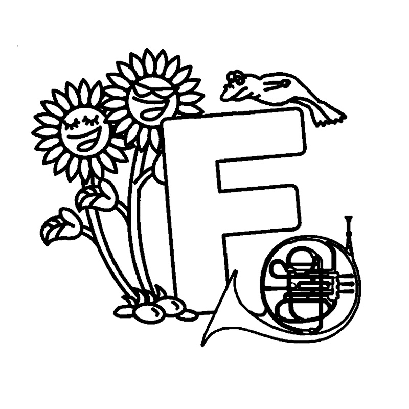 Descriere: Litera F din alfabet te asteapta sa o colorezi alaturi de cele doua flori vesele, broasca si instrumentul muzical.