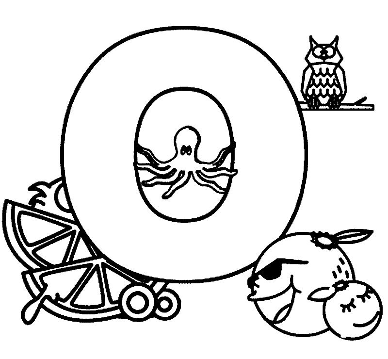 Descriere: Litera O din alfabet te asteapta sa o colorezi alaturi de caracatita si bufnita.