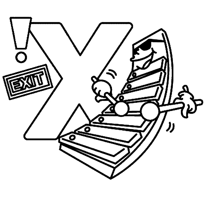 Descriere: Plansa de colorat cu litera X alaturi de un xilofon care ii canta.