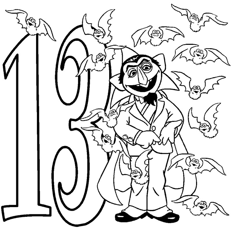 Descriere: Coloreaza numarul 13 care vrea sa celebreze Halloween-ul impreuna cu Dracula si cei treisprezece lilieci.