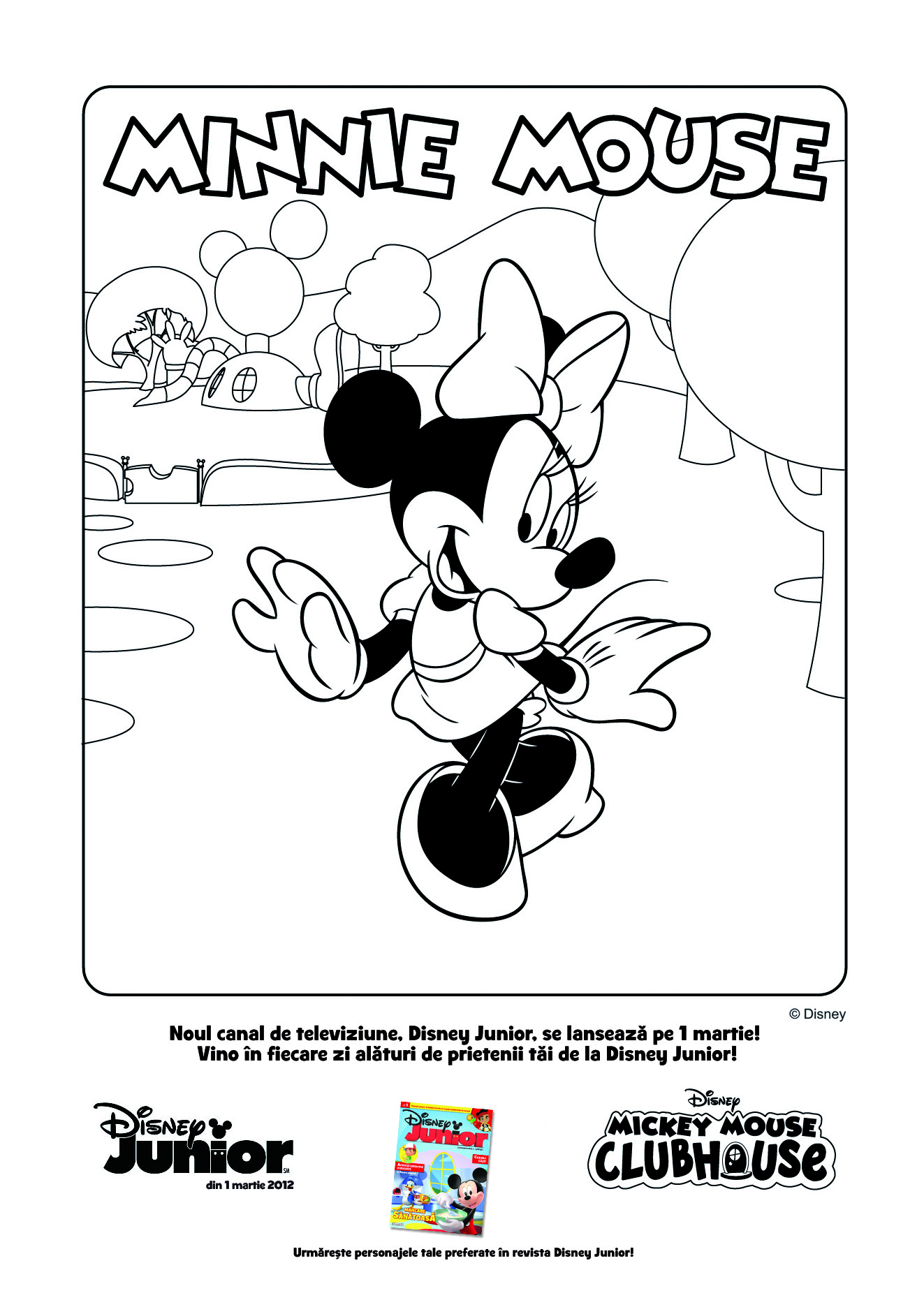 Descriere: Plansa de colorat Disney Junior cu Minnie Mouse urandu-ti bun venit in Clubhouse!