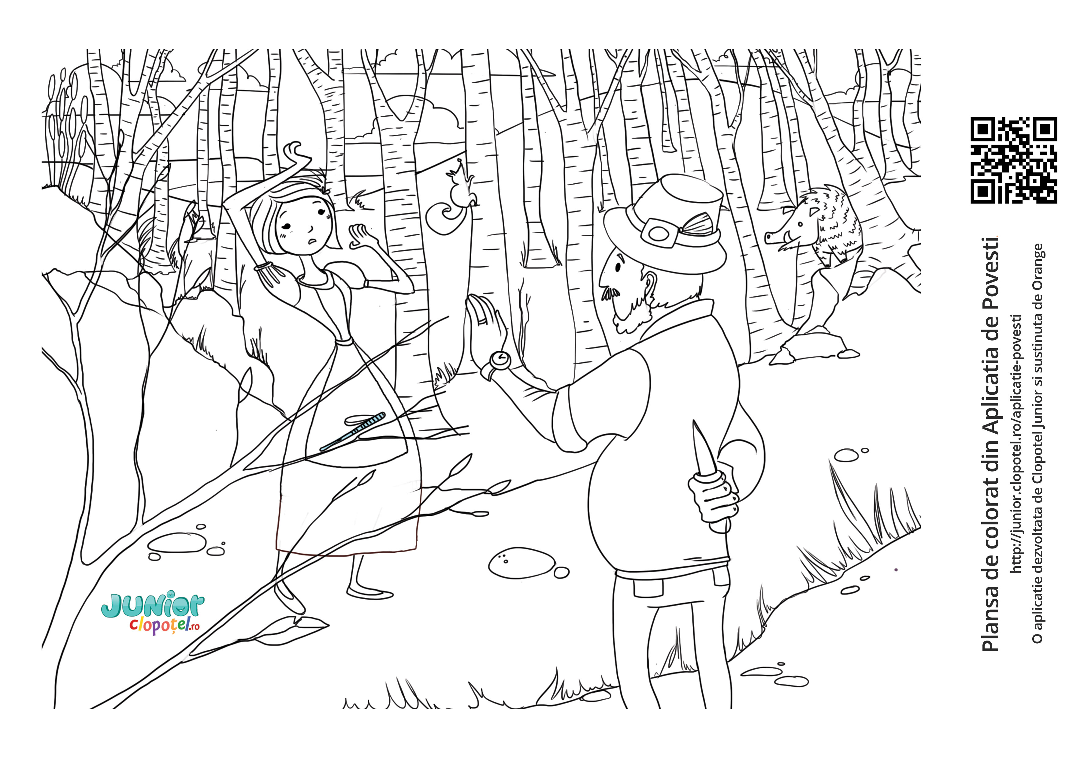 Descriere: Coloreaza plansa cu vanatorul si Alba ca Zapada in padure. Oare ce tine in mana vanatorul? Scena din aplicatia POVESTI. Daca vrei sa descoperi mai multe basme sau legende, descarca-ti aplicatia din Google Play sau App Store.