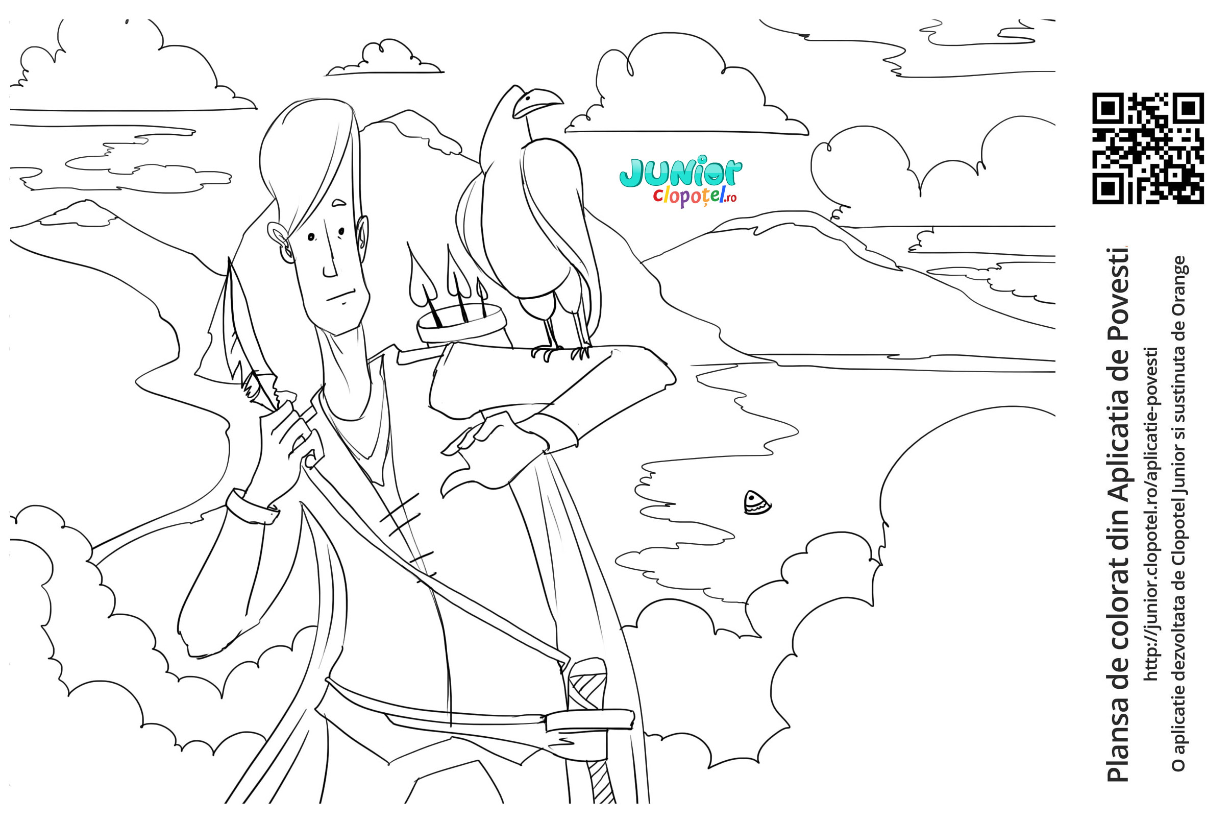 Descriere: Coloreaza plansa cu Fat-Frumos care primeste de la corb o penita. Scena din aplicatia POVESTI. Daca vrei sa descoperi mai multe basme sau legende, descarca-ti aplicatia din Google Play sau App Store.