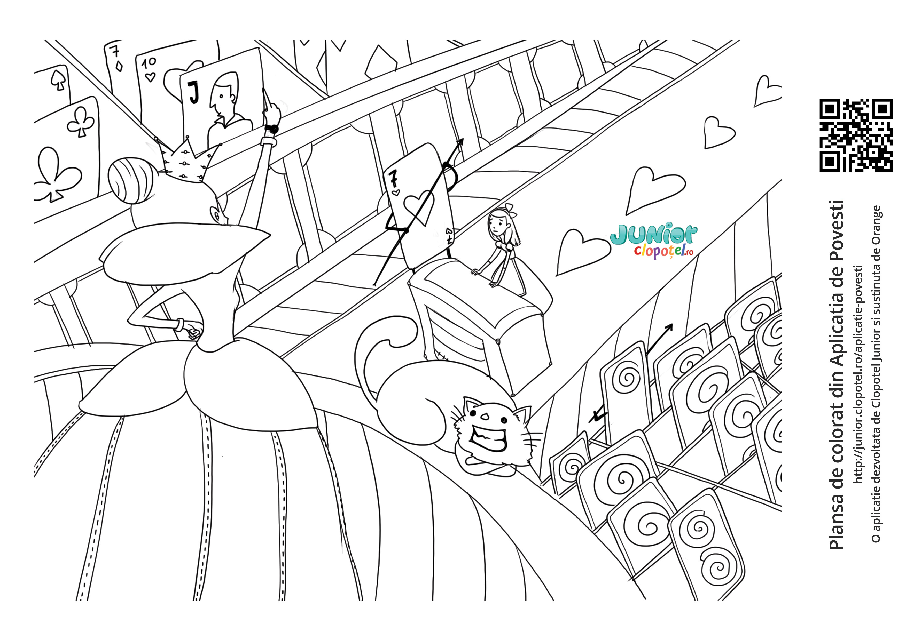 Descriere: Coloreaza plansa cu Alice in sala de judecata inconjurata de multe carti de joc. Scena din aplicatia POVESTI. Daca vrei sa descoperi mai multe basme sau legende, descarca-ti aplicatia din Google Play sau App Store.