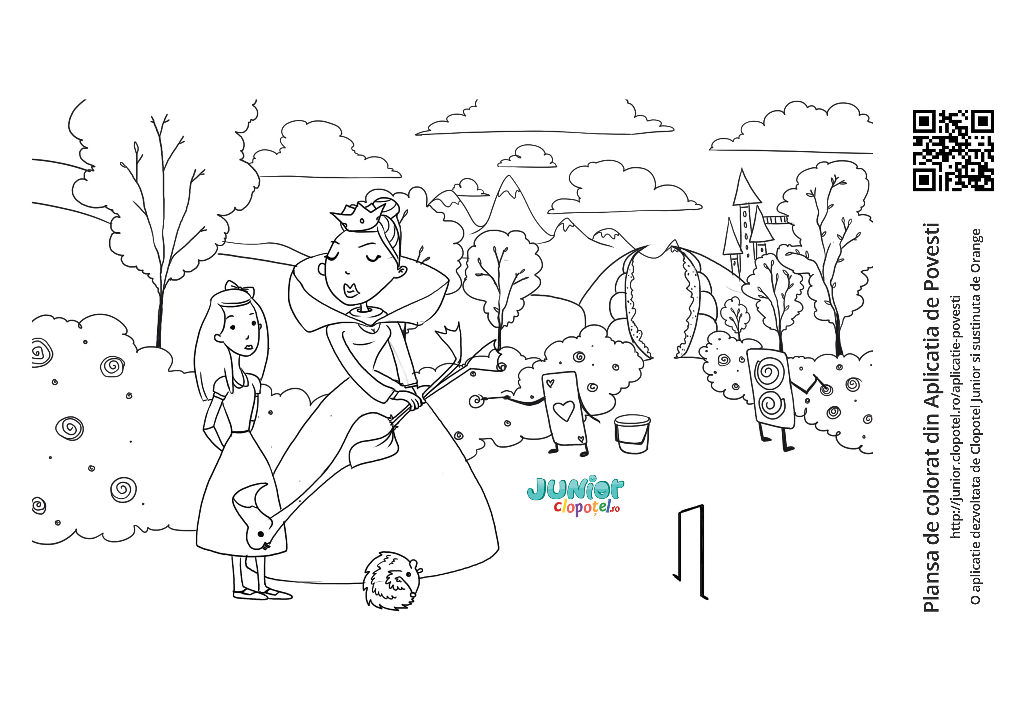 Descriere: Coloreaza plansa cu Alice si Regina de Cupa din Tara Minunilor. Regina de Cupa joaca cricket folosind in loc de ciocan o pasare flamingo si in loc de minge un arici. Scena din aplicatia POVESTI. Daca vrei sa descoperi mai multe basme sau legende, descarca-ti aplicatia din Google Play sau App Store.
