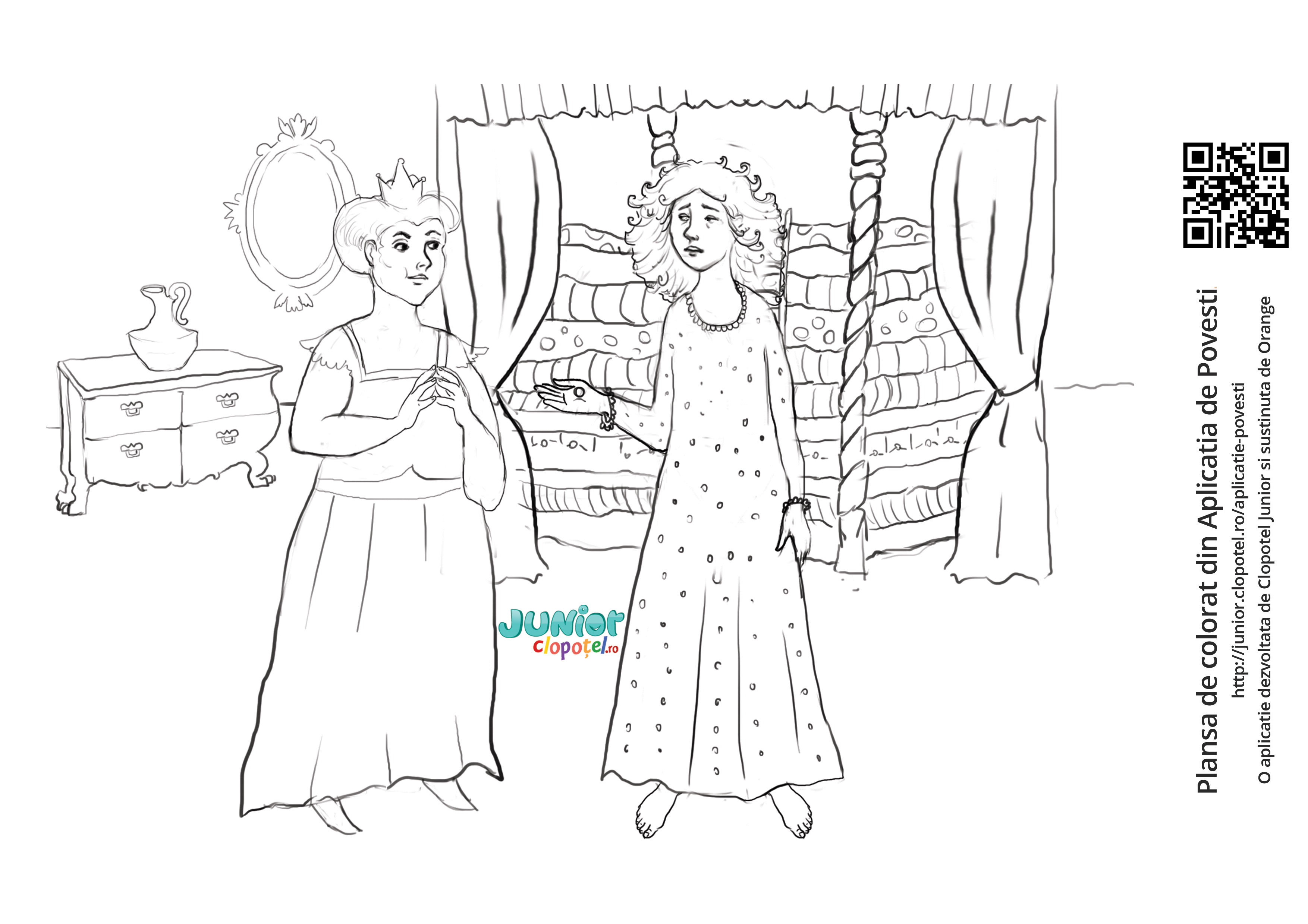 Descriere: Coloreaza plansa cu printesa si bobul de mazare. Scena din povestea "Printesa Bob de Mazare" din aplicatia POVESTI. Daca vrei sa descoperi mai multe basme sau legende, descarca-ti aplicatia din Google Play sau App Store.