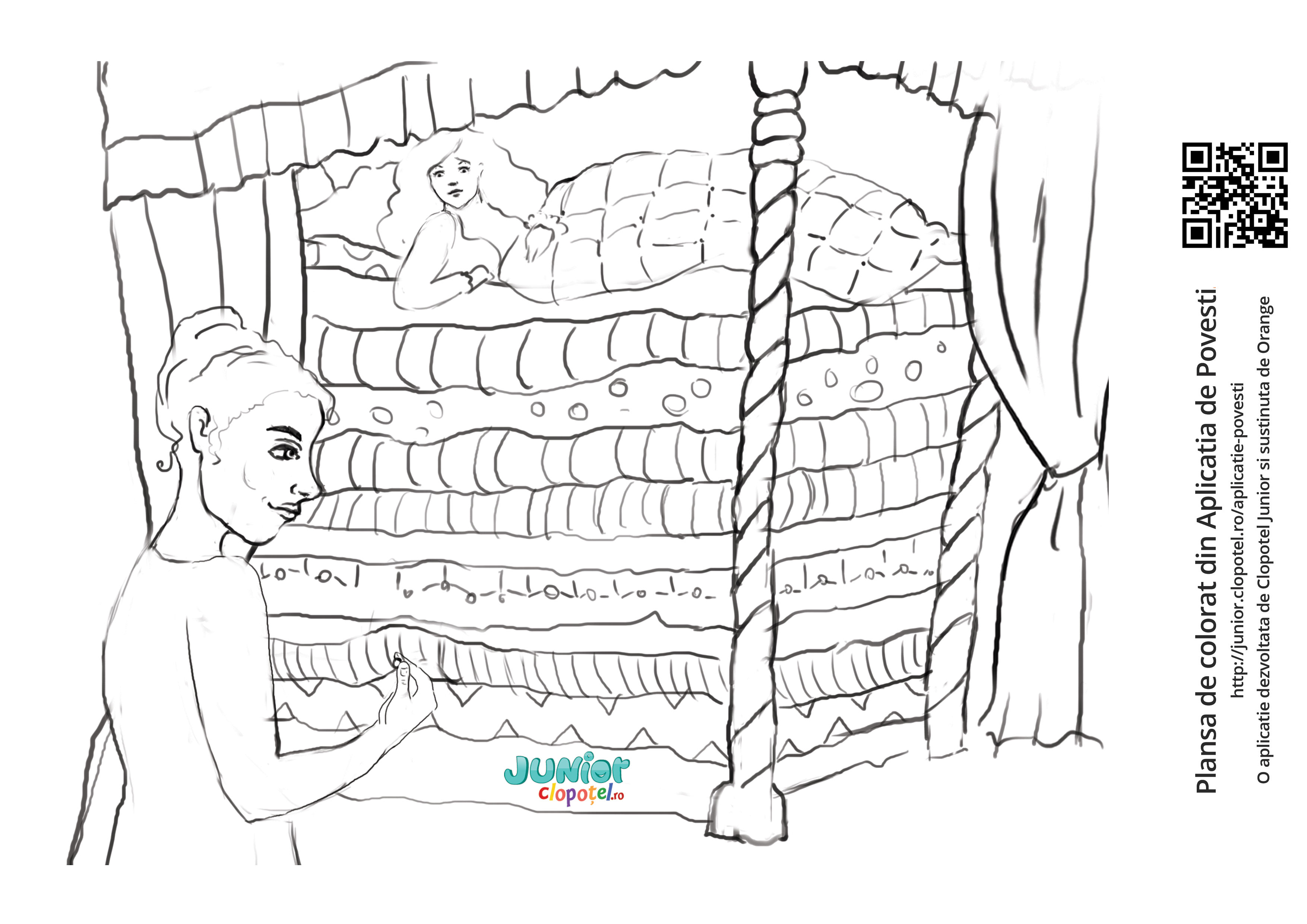 Descriere: Coloreaza plansa cu printesa, saltelele si bobul de mazare. Scena din povestea "Printesa Bob de Mazare" din aplicatia POVESTI. Daca vrei sa descoperi mai multe basme sau legende, descarca-ti aplicatia din Google Play sau App Store.