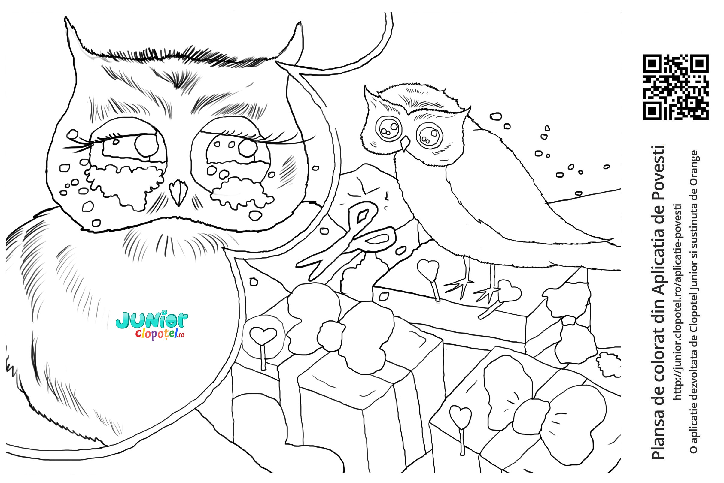 Descriere: Plansa de colorat cu o bufnita trista pentru ca nimeni nu a trecut in vizita pe la ea. Scena din povestea G, pisoii si cutia fermecata din aplicatia POVESTI. Daca vrei sa descoperi mai multe basme, descarca-ti aplicatia din Google Play sau App Store.