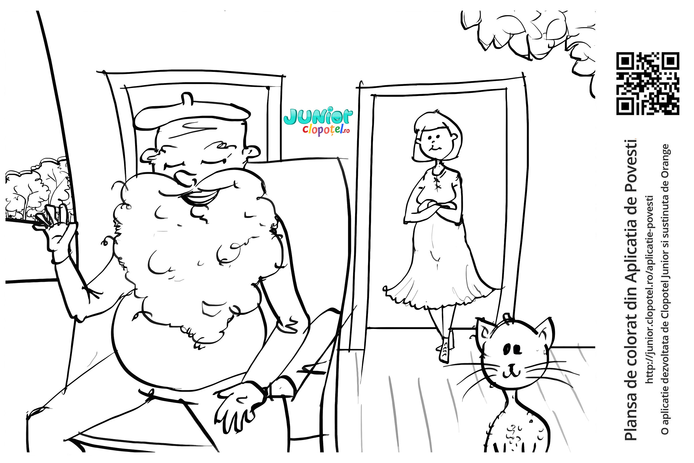Descriere: Plansa de colorat cu bunicul, mama si pisica. Scena din povestea "Bunicul" din aplicatia POVESTI. Daca vrei sa descoperi mai multe basme, descarca-ti aplicatia din Google Play sau App Store.