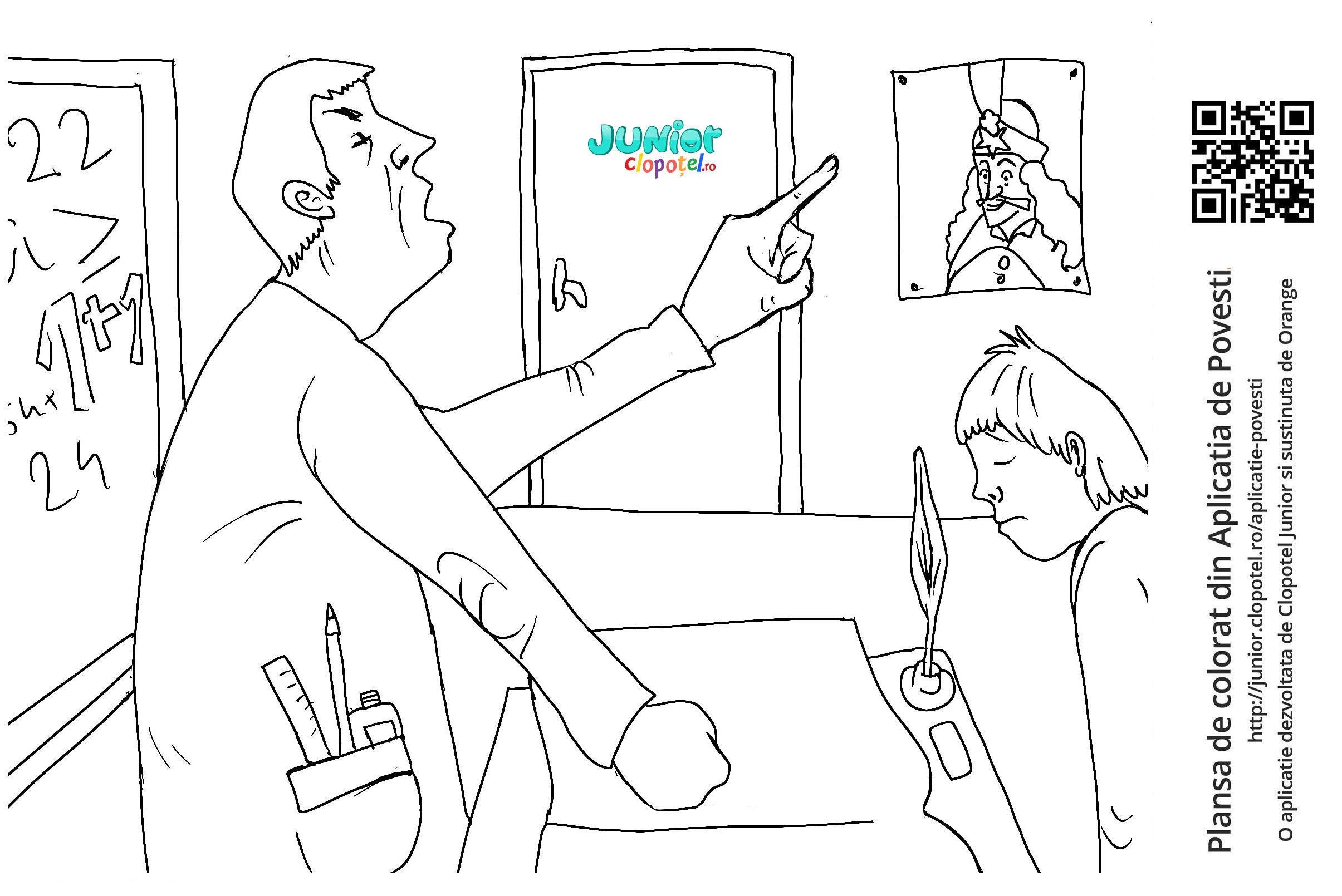 Descriere: Coloreaza plansa cu dascalul suparat pe Canuta pentru ca nu a invatat lectia. Scena din povestea "Canuta om sucit" din aplicatia POVESTI. Daca vrei sa descoperi mai multe opere literare, descarca-ti aplicatia din Google Play sau App Store.