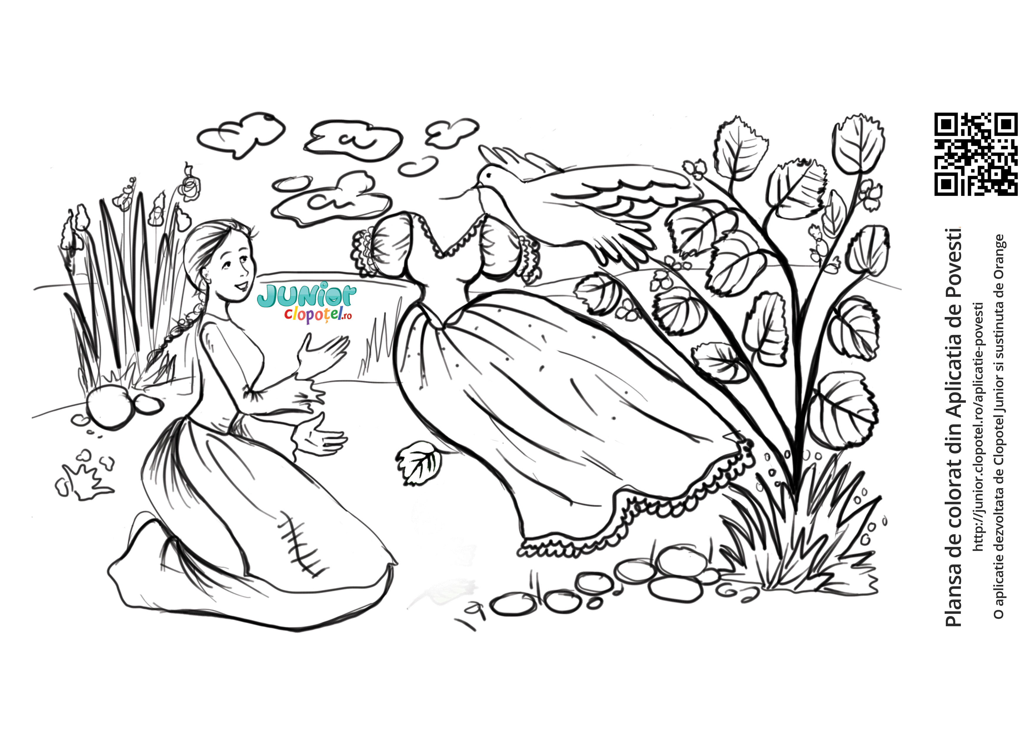 Descriere: Plansa de colorat cu Cenusareasa care primeste de la o pasarica rochia pentru petrecere. Scena din aplicatia POVESTI. Daca vrei sa descoperi mai multe basme sau legende, descarca-ti aplicatia din Google Play sau App Store.