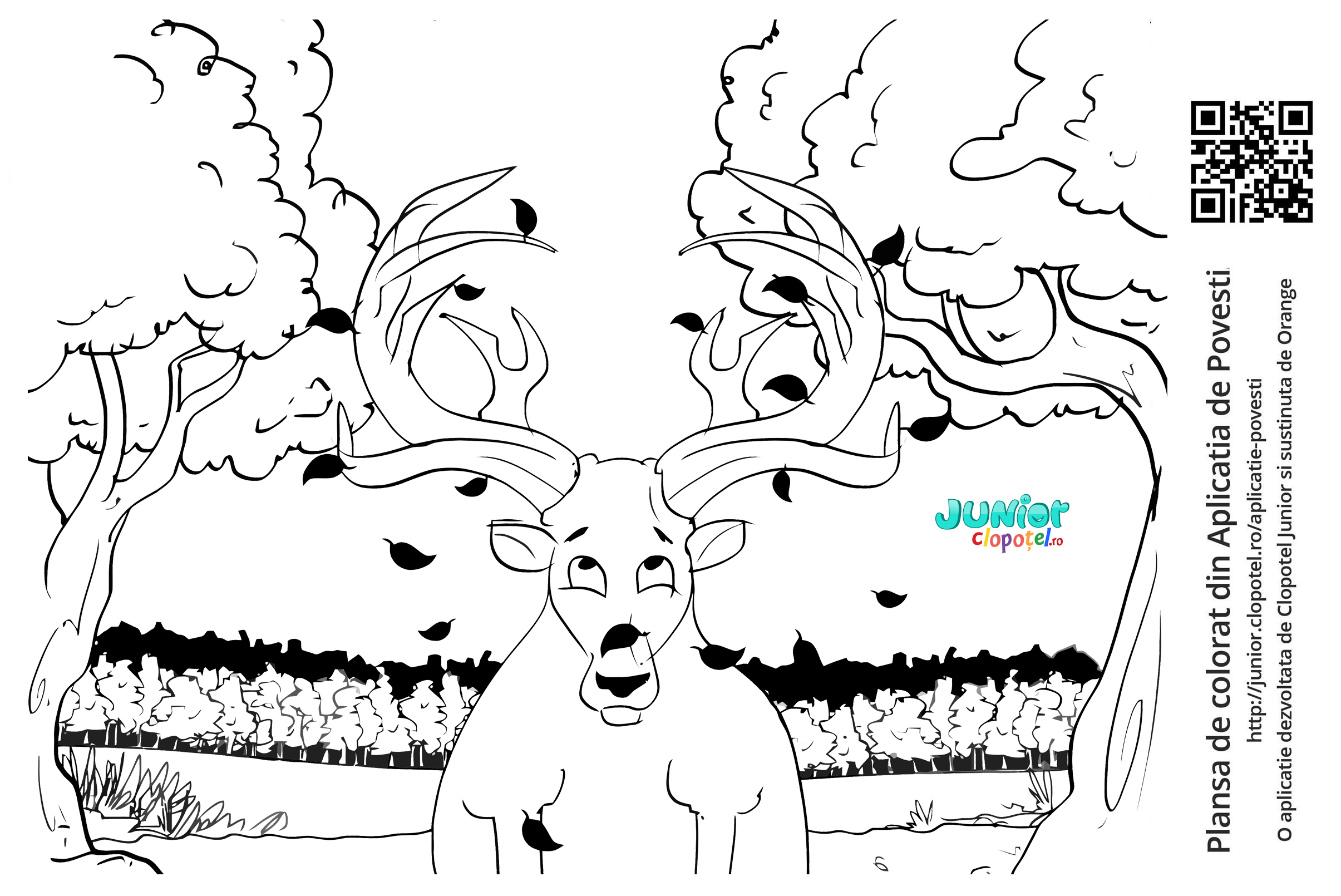 Descriere: Plansa de colorat cu cerbul falos si fricos ce a ramas fara frunze, crengile transformandu-se in coarne. Scena din povestea "Legenda Cerbului" din aplicatia POVESTI. Daca vrei sa descoperi mai multe basme, descarca-ti aplicatia din Google Play sau App Store.
