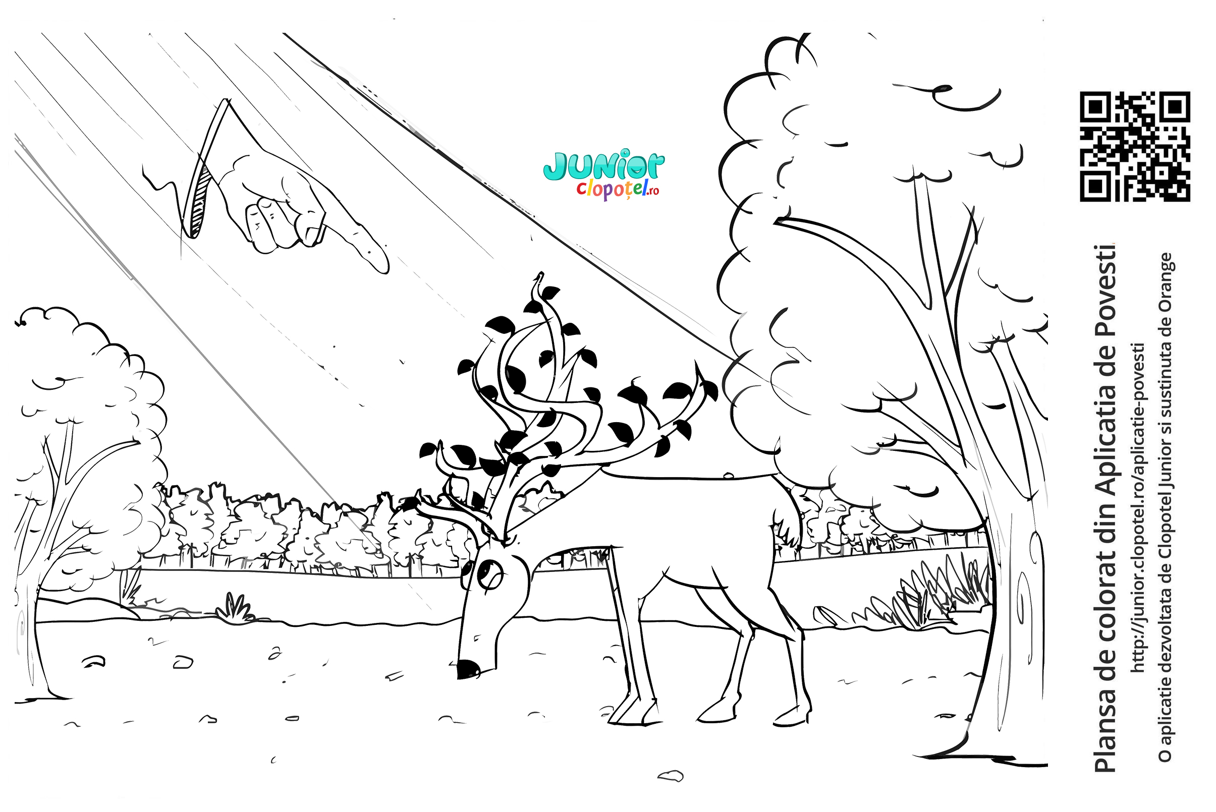 Descriere: Plansa de colorat cu cerbul certat de Dumnezeu. Scena din povestea "Legenda Cerbului" din aplicatia POVESTI. Daca vrei sa descoperi mai multe basme, descarca-ti aplicatia din Google Play sau App Store.