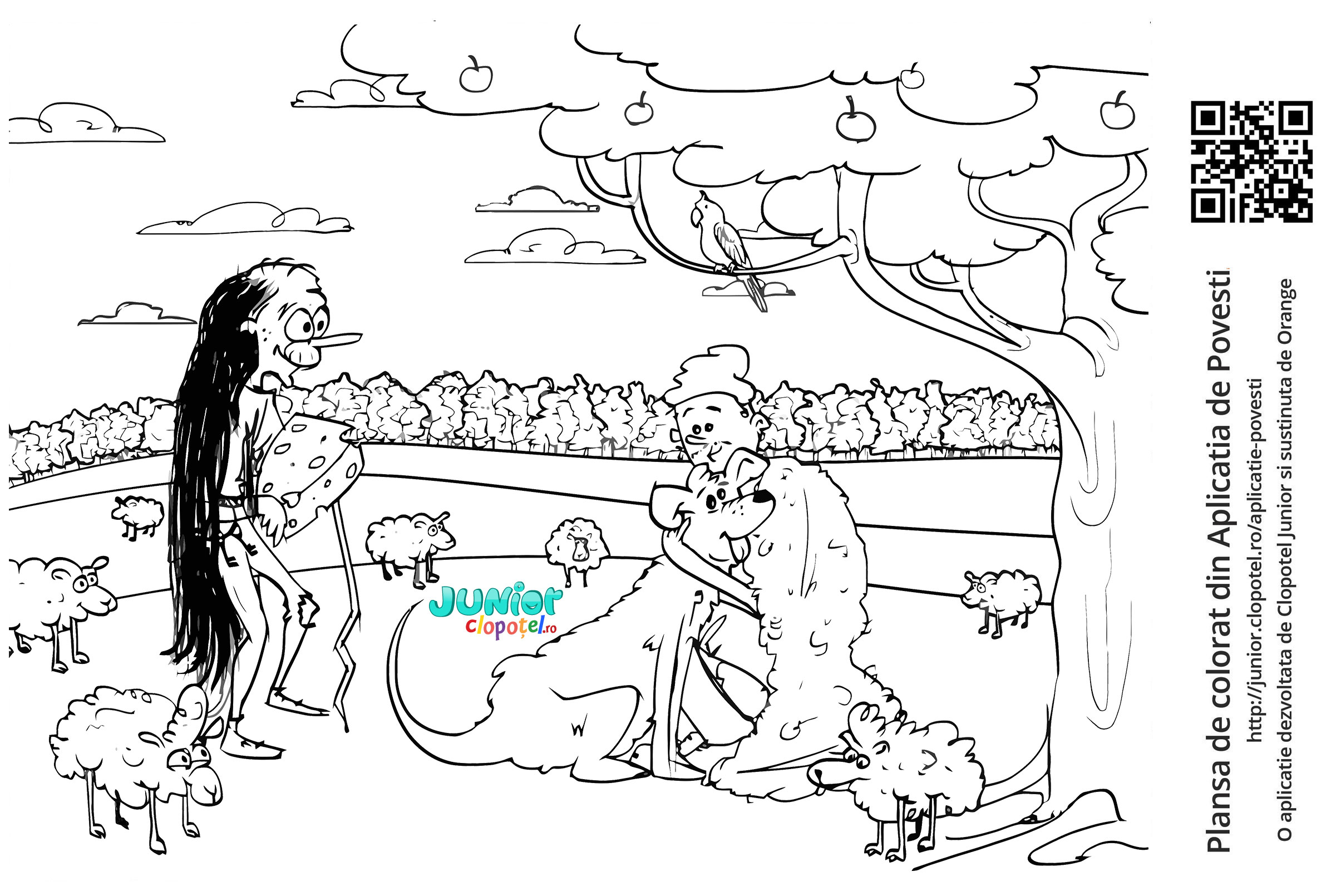 Descriere: Plansa de colorat cu ciobanul si cainele. Scena din "Legenda Cainelui" din aplicatia POVESTI. Daca vrei sa descoperi mai multe basme, descarca-ti aplicatia din Google Play sau App Store.