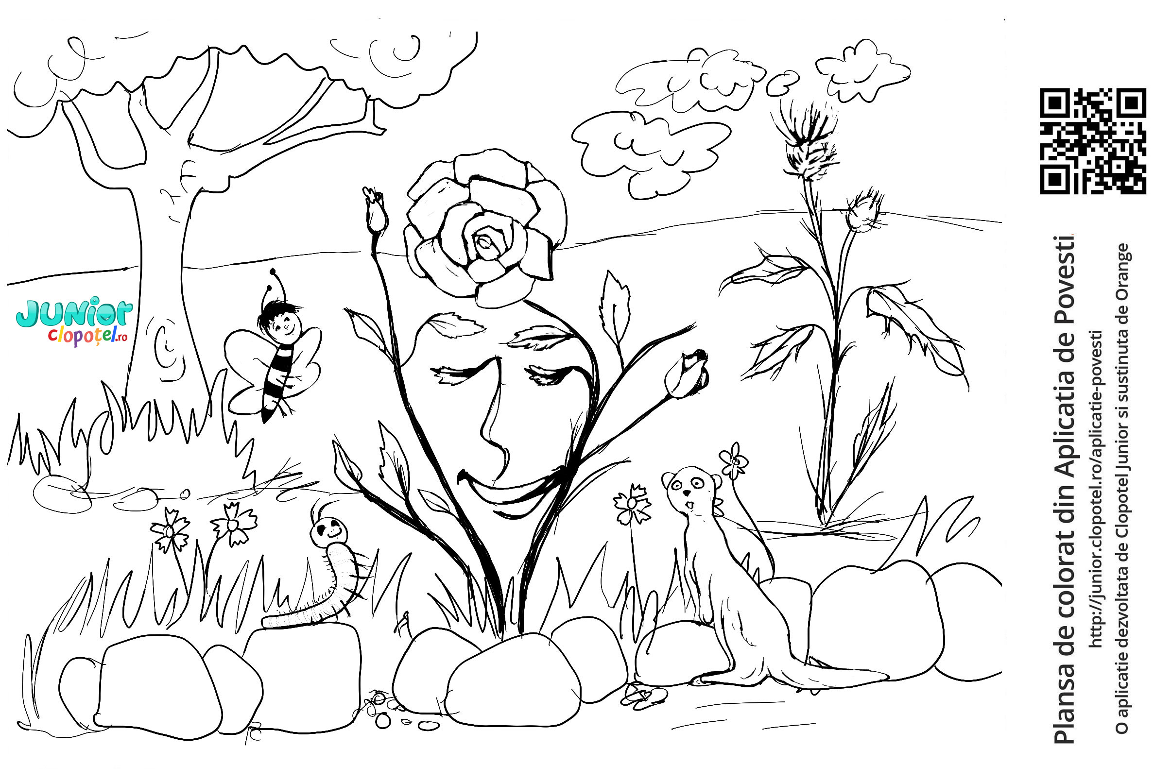 Descriere: Plansa de colorat cu trandafirul si scaiul din povestea Legenda Trandafirului si a Scaiului din aplicatia POVESTI. Daca vrei sa descoperi mai multe basme, descarca-ti aplicatia din Google Play sau App Store.