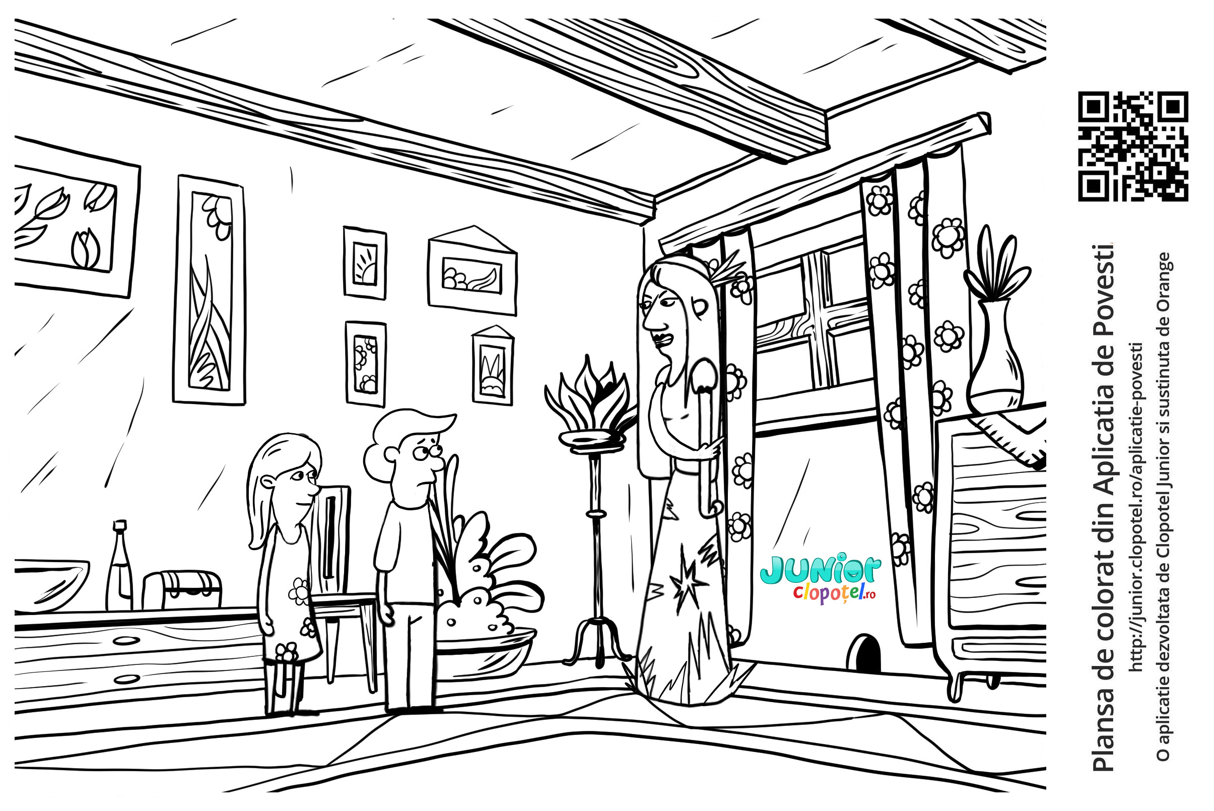 Descriere: Plansa de colorat cu copiii lui Irinel si fiica lui Mos Crivat. Scena din "Legenda Ghioceilor" din aplicatia POVESTI. Daca vrei sa descoperi mai multe basme sau legende, descarca-ti aplicatia din Google Play sau App Store.