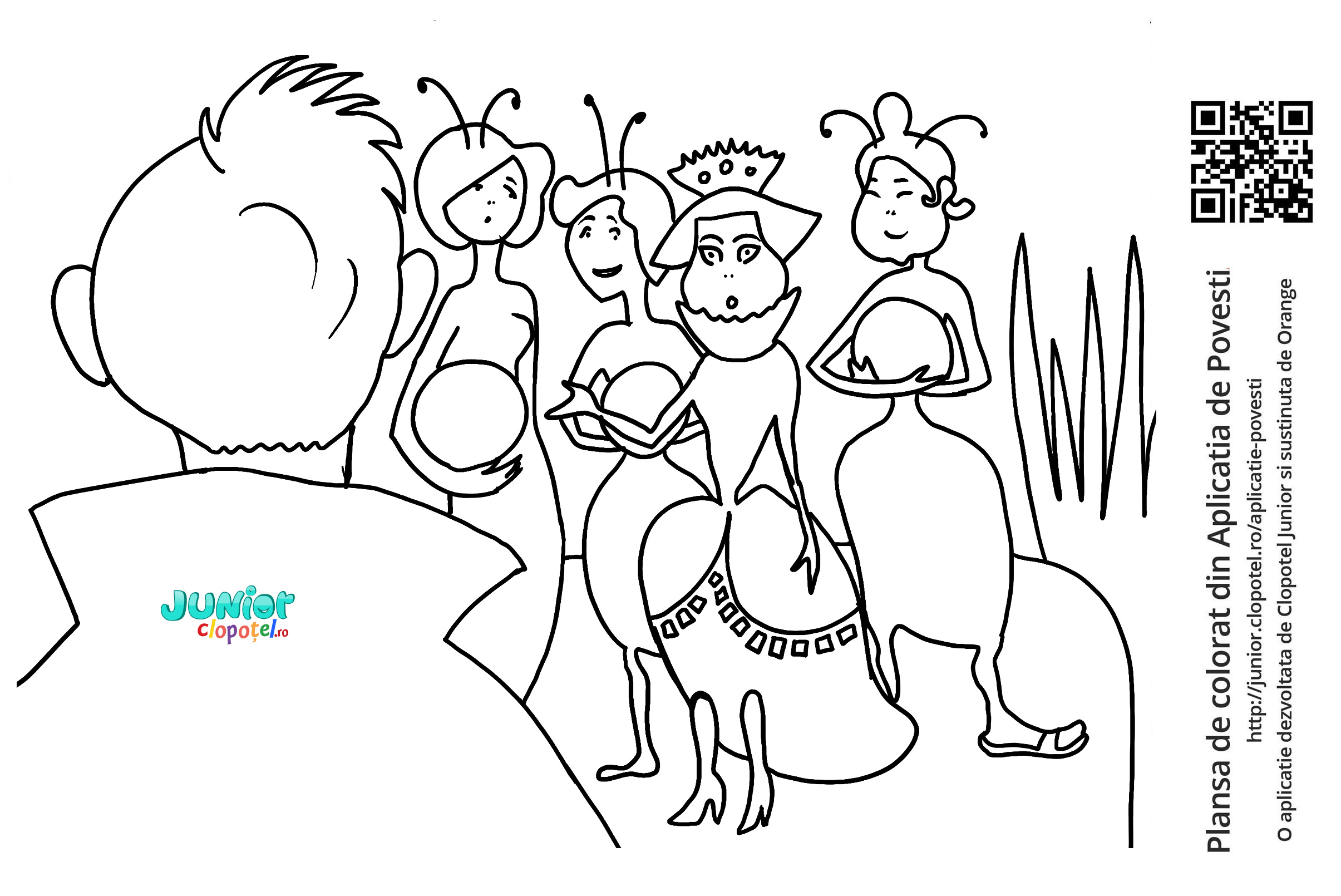 Descriere: Plansa de colorat cu Craiasa Furnicilor ce il ajuta pe Prostila sa adune cele o mie de boabe de margaritar. Scena din basmul "Regina Albinelor" din aplicatia POVESTI. Daca vrei sa descoperi mai multe basme sau legende, descarca-ti aplicatia din Google Play sau App Store.