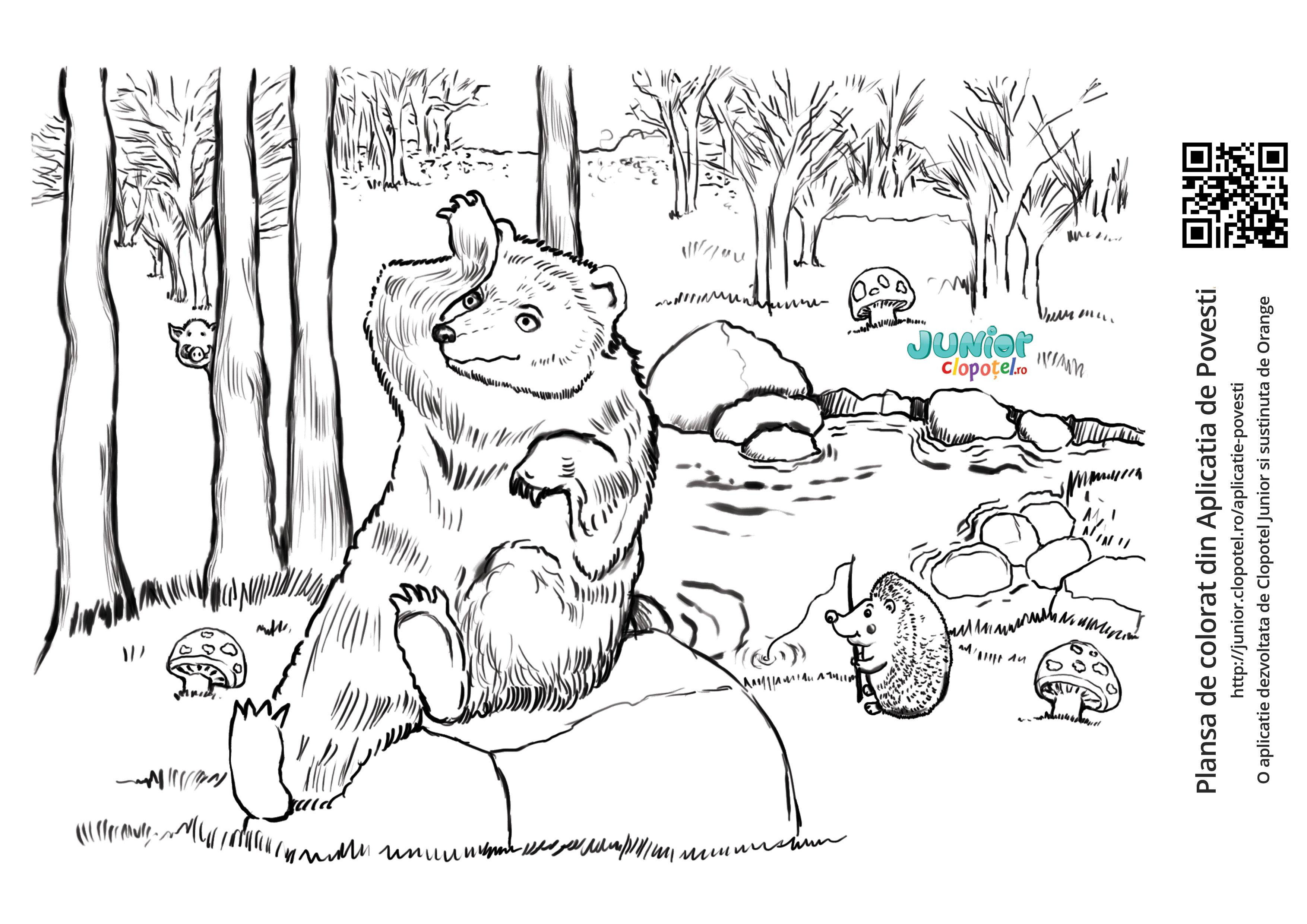 Descriere: Plansa de colorat cu ursul care tine coada in apa ca sa prinda peste. Scena din povestea "Ursul pacalit de vulpe". Citeste sau asculta povestea ori verifica-ti cunostintele in testul "Ursul pacalit de vulpe".