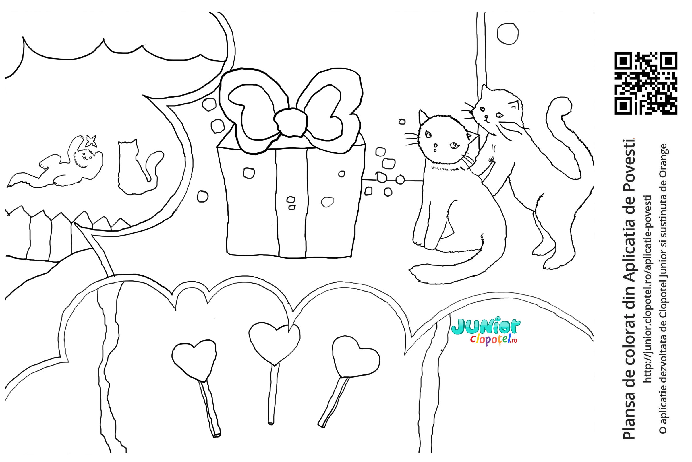 Descriere: Plansa de colorat cu cutia roz ce are in ea acadele pentru G si cei doi pisoi. Scena din povestea G, pisoii si cutia fermecata din aplicatia POVESTI. Daca vrei sa descoperi mai multe basme, descarca-ti aplicatia din Google Play sau App Store.