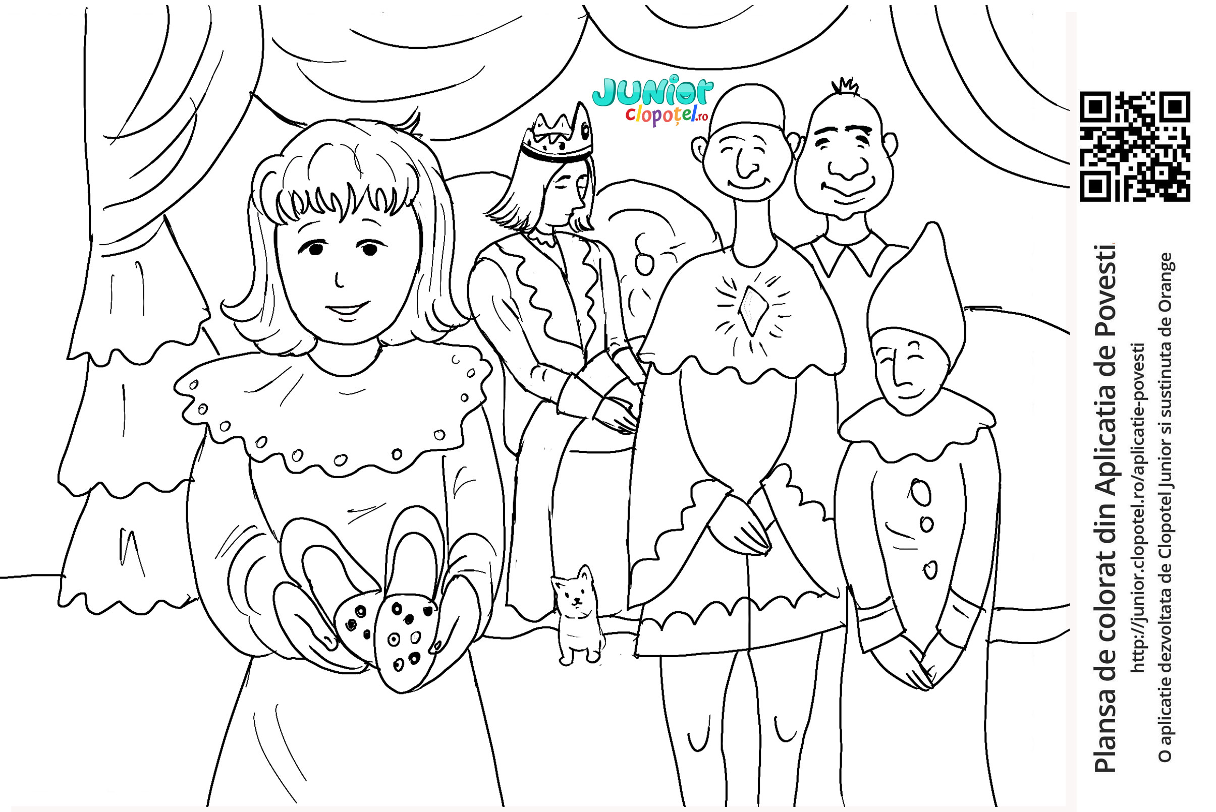 Descriere: Plansa de colorat cu feciorul de imparat si cei trei servitori care nu mai sunt fermecati. Scena din povestea Casuta din Padure din aplicatia POVESTI. Daca vrei sa descoperi mai multe basme, descarca-ti aplicatia din Google Play sau App Store.