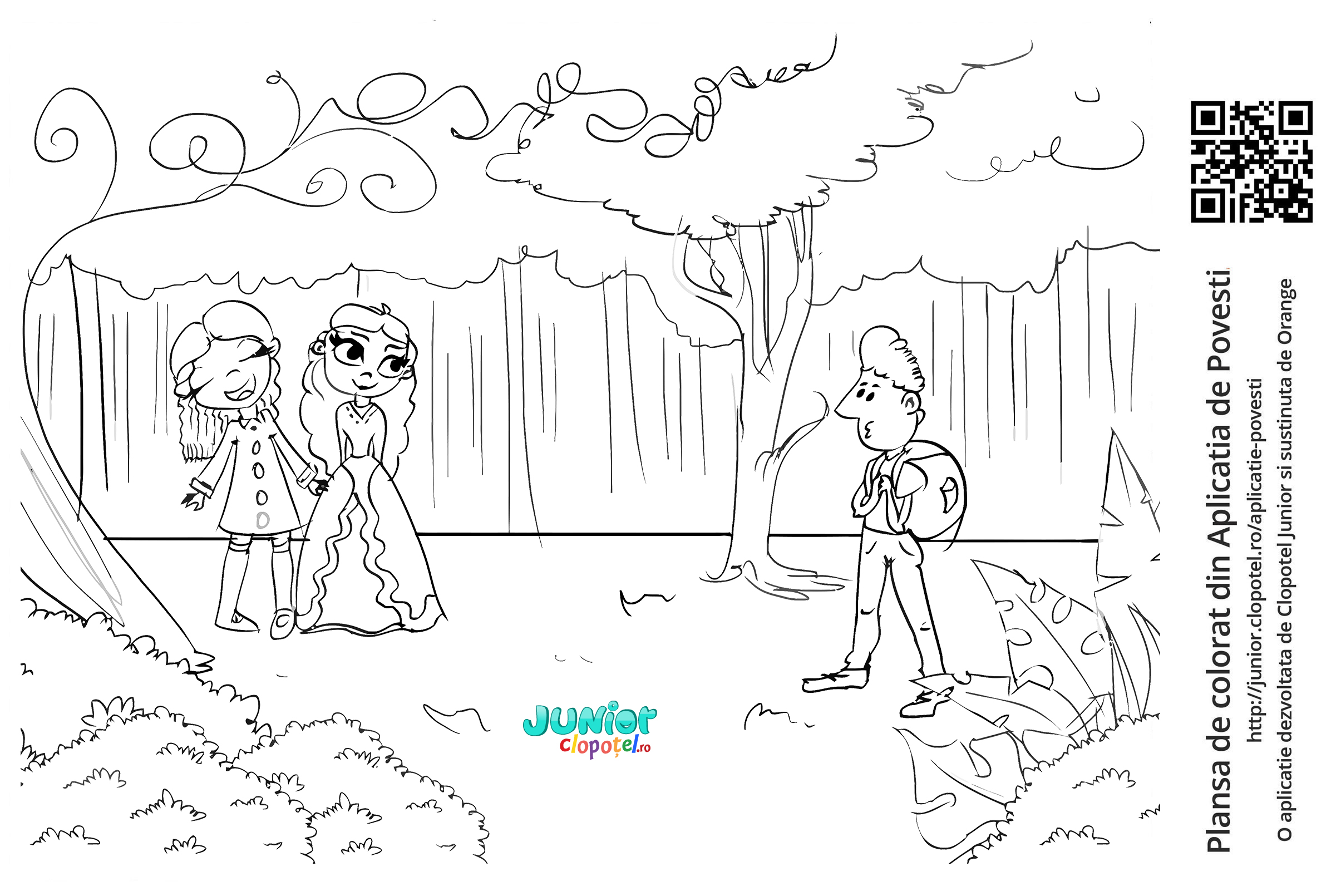 Descriere: Plansa de colorat cu voinicul si cele doua fete. Scena din povestea "Luceafarul de seara si Luceafarul de dimineata" din aplicatia POVESTI. Daca vrei sa descoperi mai multe basme, descarca-ti aplicatia din Google Play sau App Store.