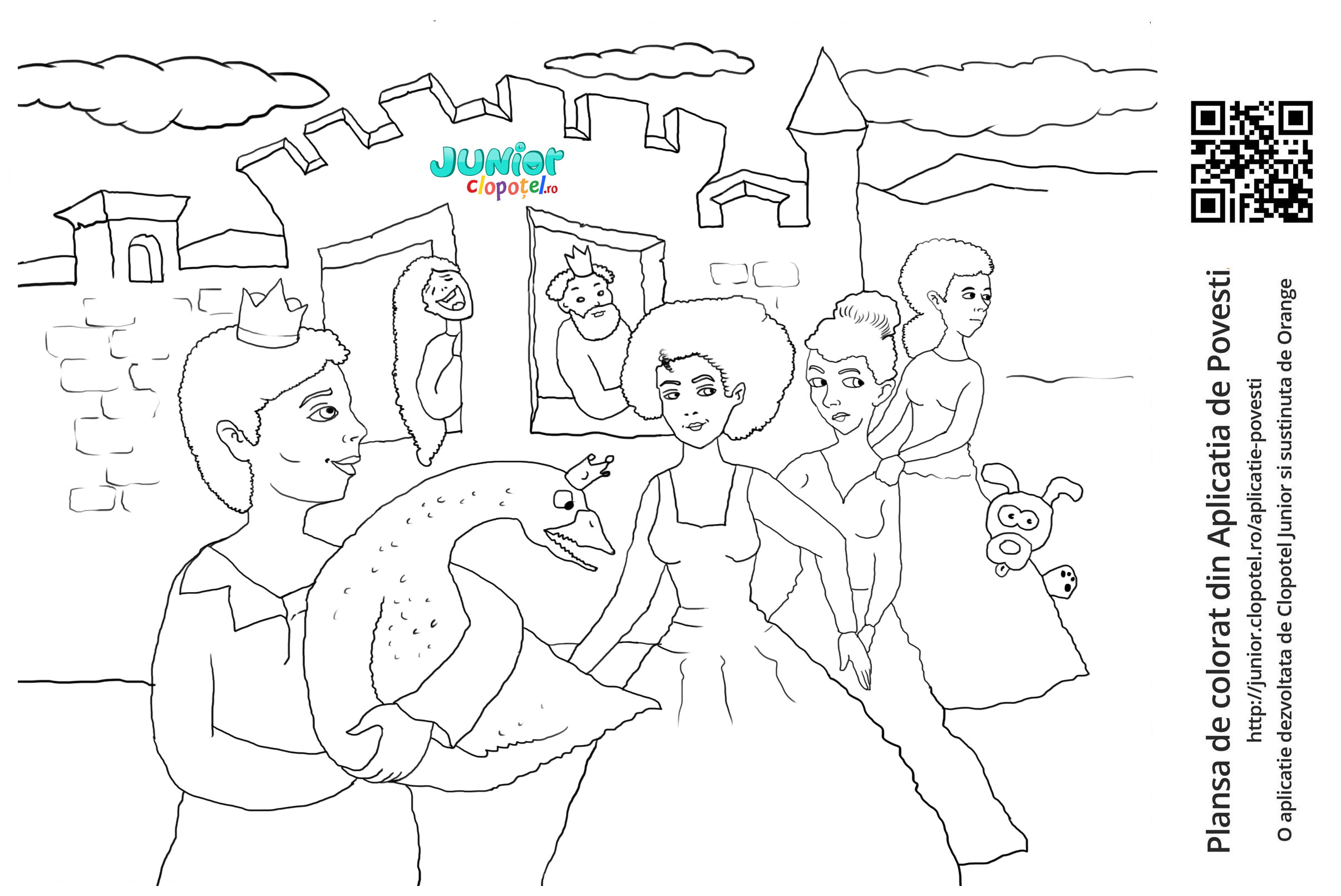 Descriere: Plansa de colorat cu fiicele hangiului lipite de gasca de aur. Scena din povestea "Gasca de aur" pe care o poti citi AICI.
