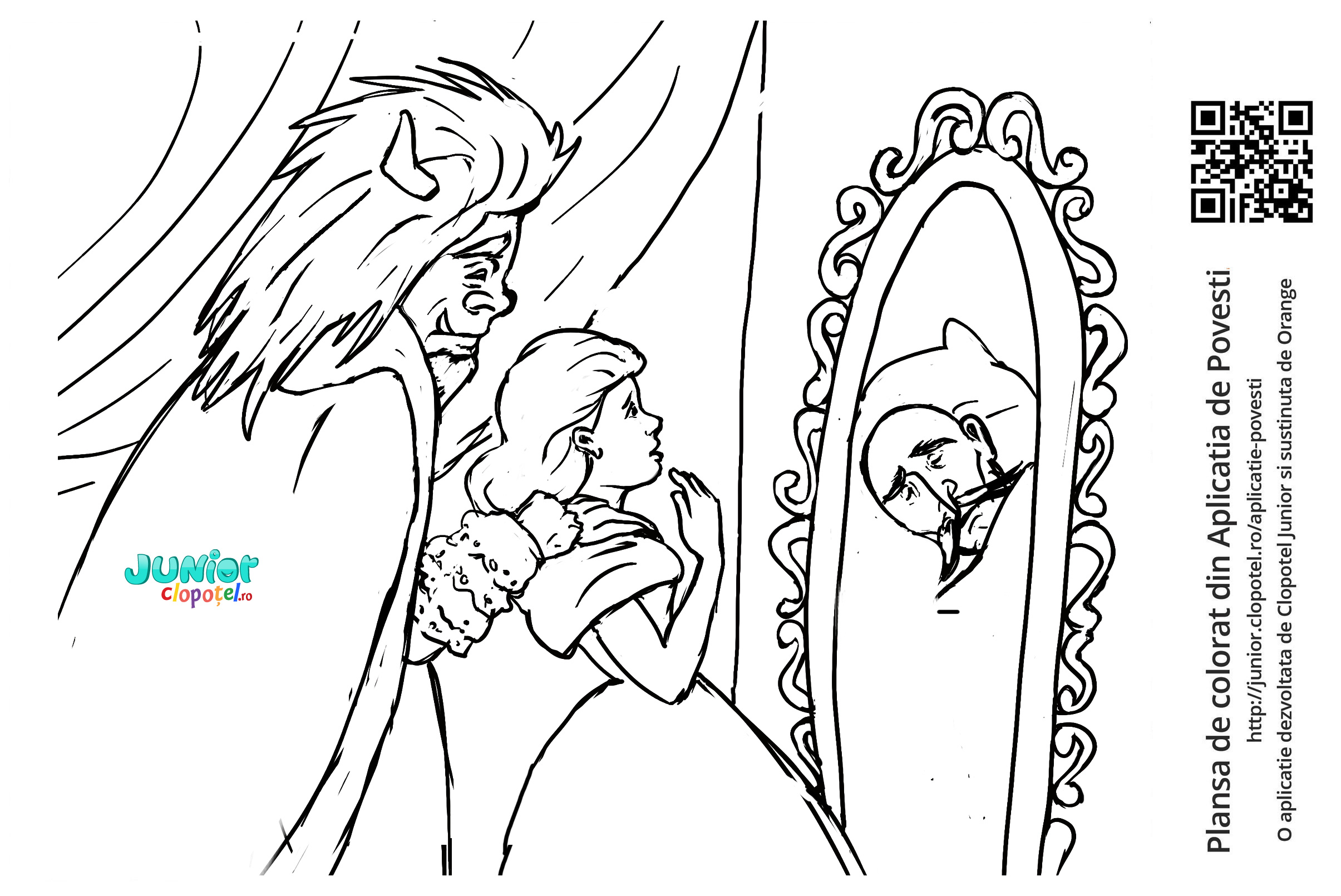 Descriere: Plansa de colorat cu Frumoasa care isi vede tatal bolnav in oglinda fermecata. Scena din "Frumoasa si bestia".