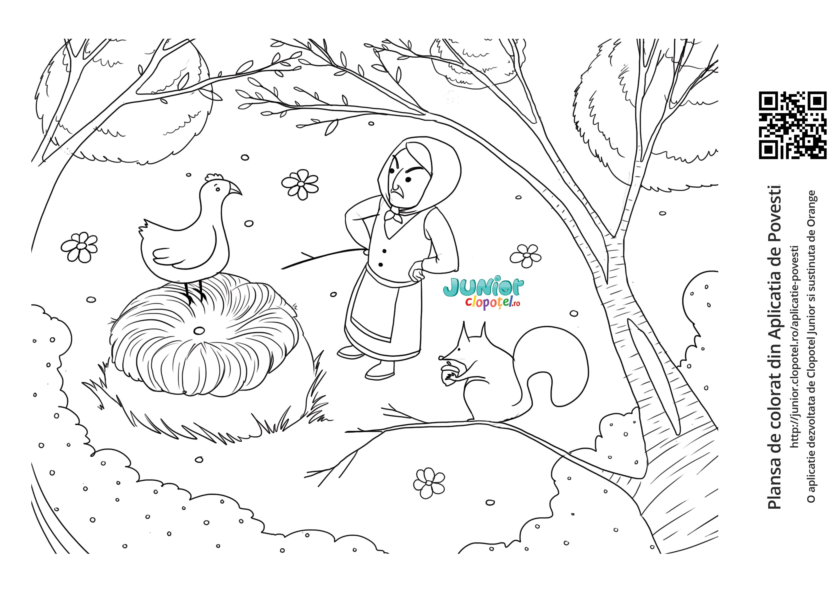Descriere: Coloreaza plansa cu gaina care se ouase o margica. Scena din povestea "Punguta cu doi bani" din aplicatia POVESTI. Daca vrei sa descoperi mai multe basme sau legende, descarca-ti aplicatia din Google Play sau App Store.