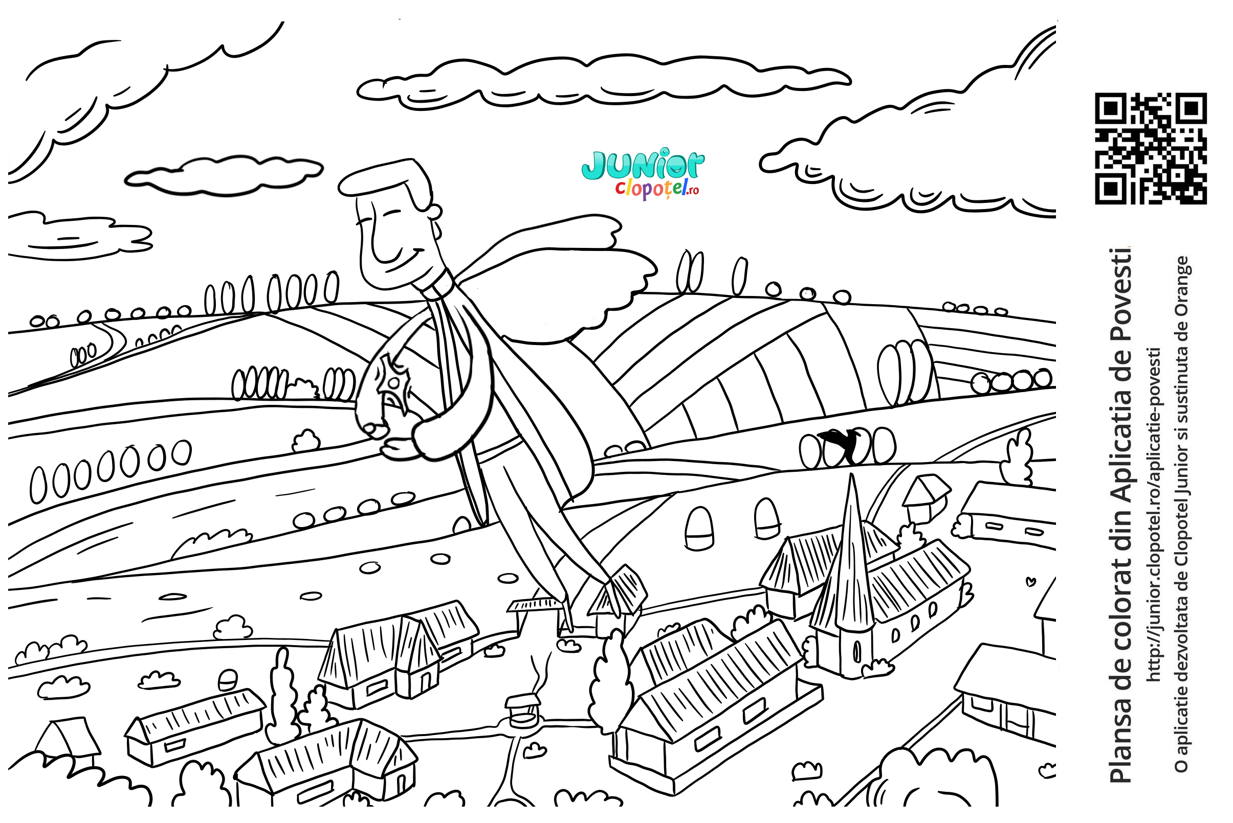 Descriere: Plansa de colorat cu ingerul zburand spre cer. Scena din "Povestea Viorelei" din aplicatia POVESTI. Daca vrei sa descoperi mai multe basme, descarca-ti aplicatia din Google Play sau App Store.