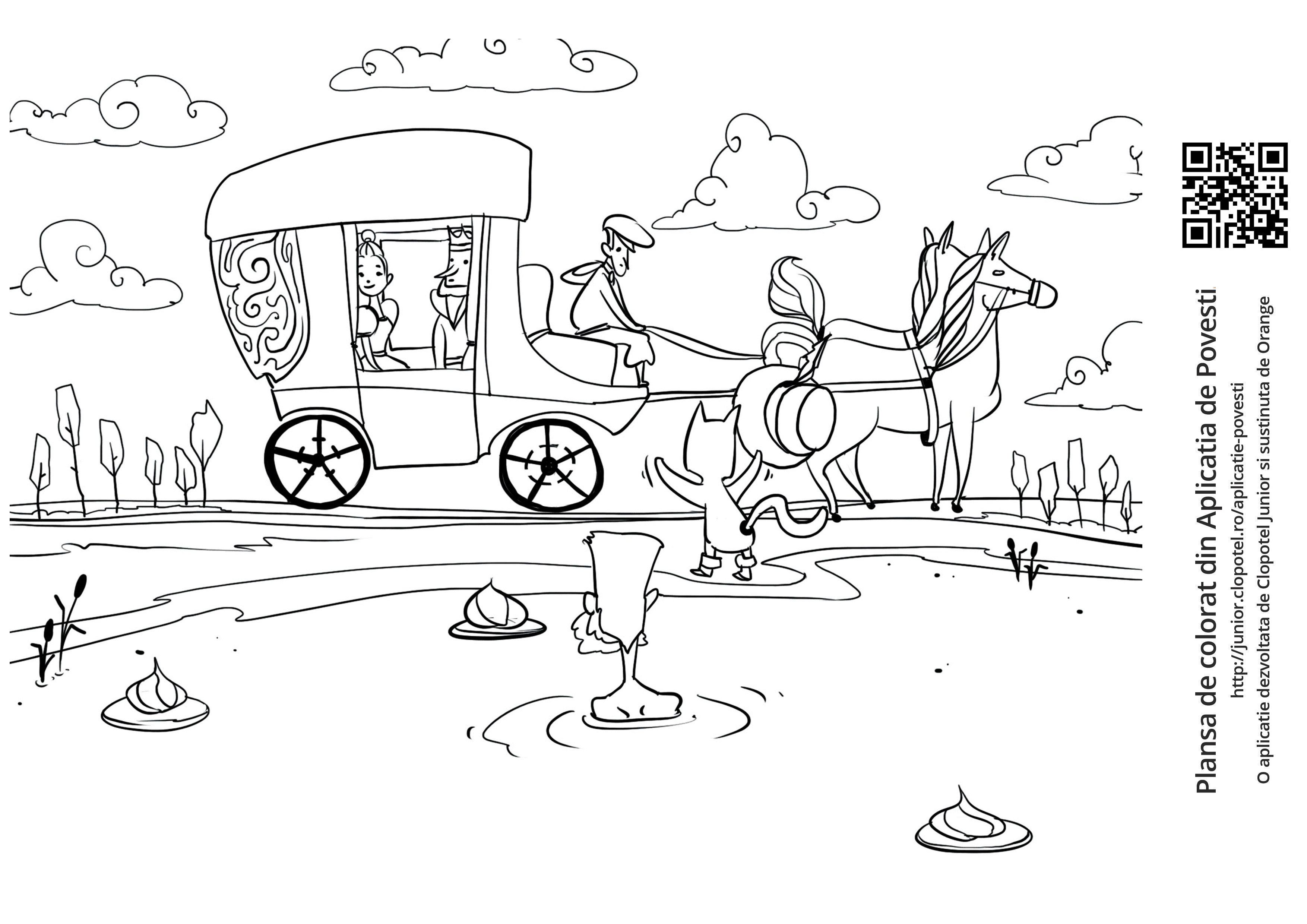 Descriere: Coloreaza plansa cu caleasca regelui care se opreste sa-l salveze pe Marchizul de Carabas. Scena din "Motanul incaltat" din aplicatia POVESTI. Daca vrei sa descoperi mai multe basme sau legende, descarca-ti aplicatia din Google Play sau App Store.