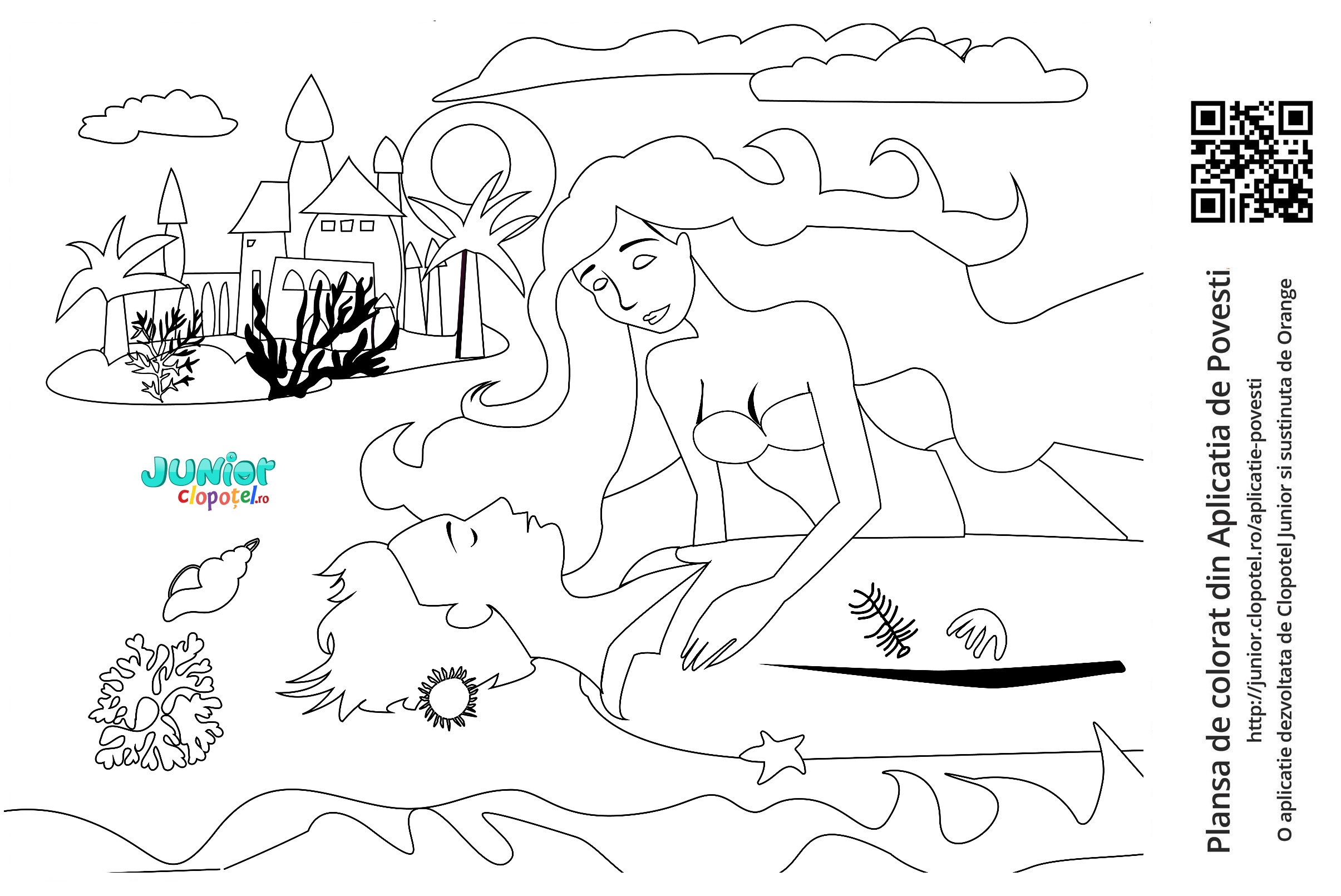 Descriere: Plansa de colorat cu printul salvat de Mica Sirena. Scena din "Mica Sirena" din aplicatia POVESTI. Daca vrei sa descoperi mai multe basme sau legende, descarca-ti aplicatia din Google Play sau App Store.