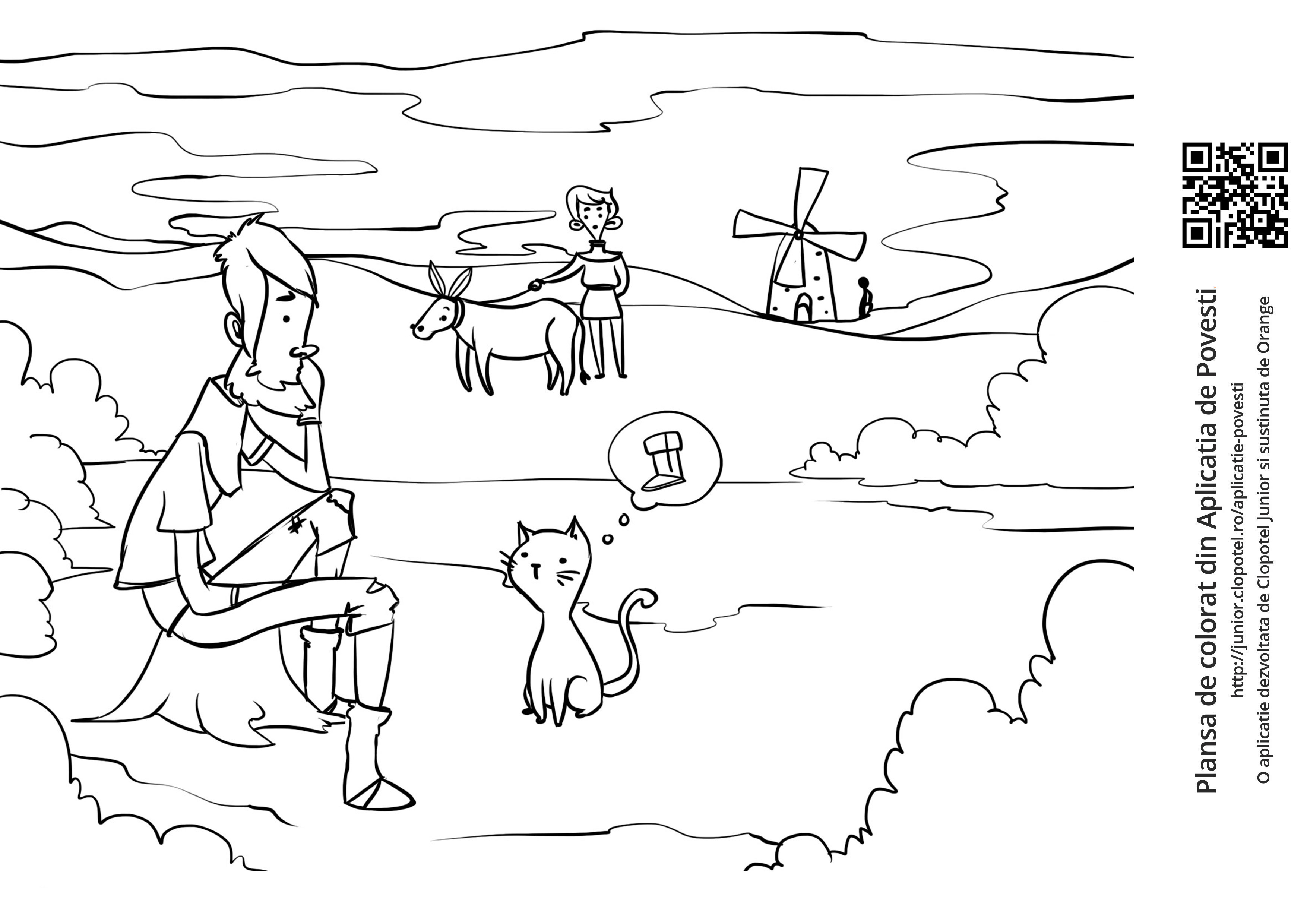 Descriere: Coloreaza plansa cu motanul care ii cere stapanului un sac si o pereche de cizme. Scena din "Motanul incaltat" din aplicatia POVESTI. Daca vrei sa descoperi mai multe basme sau legende, descarca-ti aplicatia din Google Play sau App Store.
